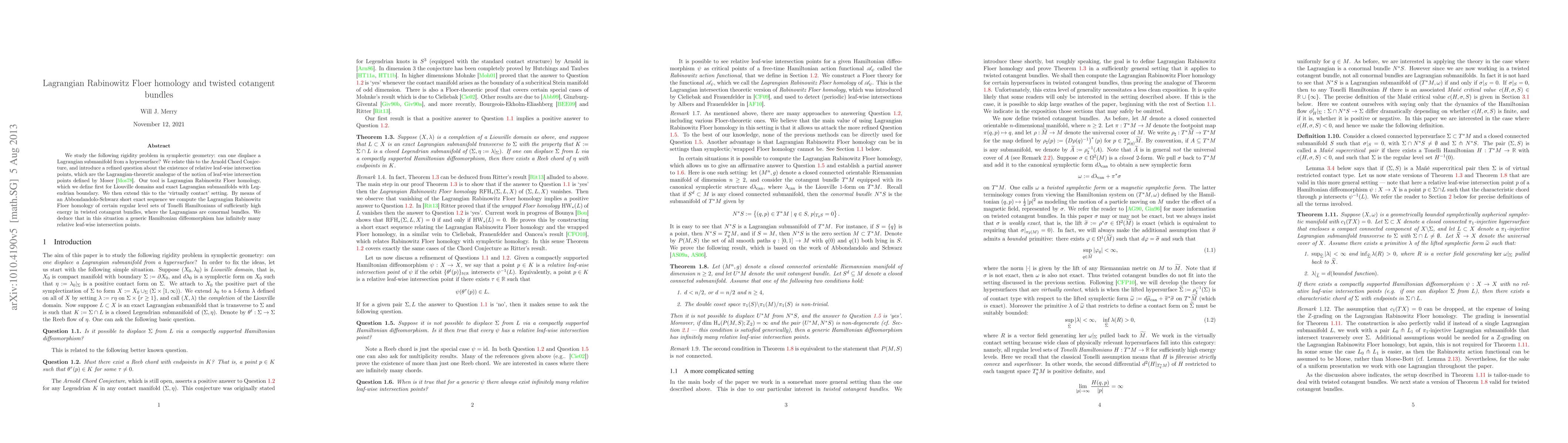 This paper explores the rigidity problem in symplectic geometry regarding the displacement of Lagrangian submanifolds from hypersurfaces, linking it to the Arnold Chord Conjecture. It introduces Lagrangian Rabinowitz Floer homology to analyze relative leaf-wise intersection points and computes this homology for certain twisted cotangent bundles, proving that generic Hamiltonian diffeomorphisms in these settings have infinitely many such intersection points.