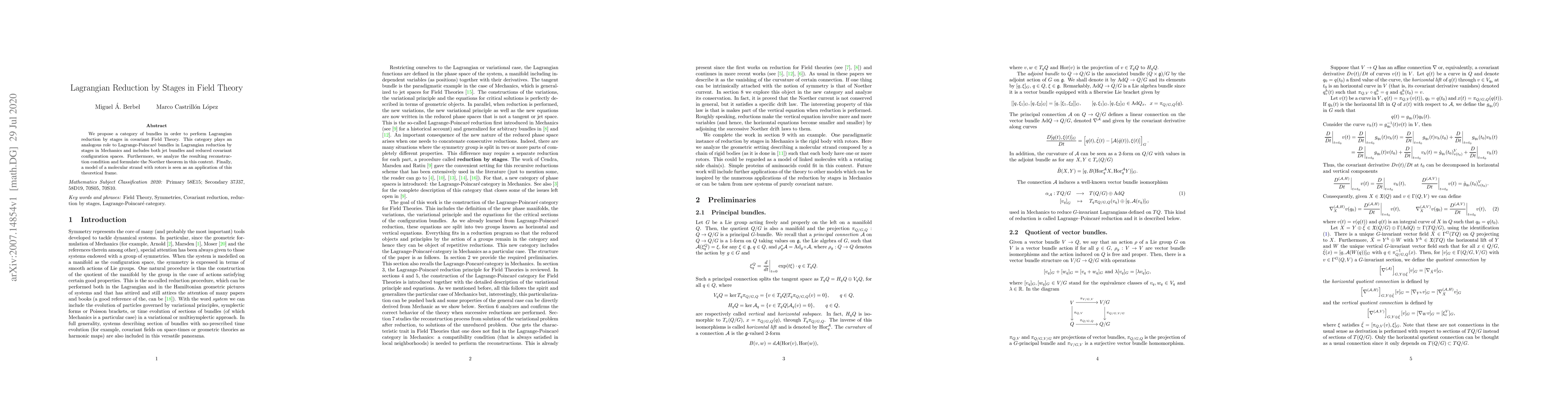 This paper introduces a category of bundles for staged Lagrangian reduction in covariant Field Theory, analogous to Lagrange-Poincaré bundles in Mechanics, and applies the theoretical framework to a molecular strand model with rotors, including a reconstruction condition and a Noether theorem formulation.