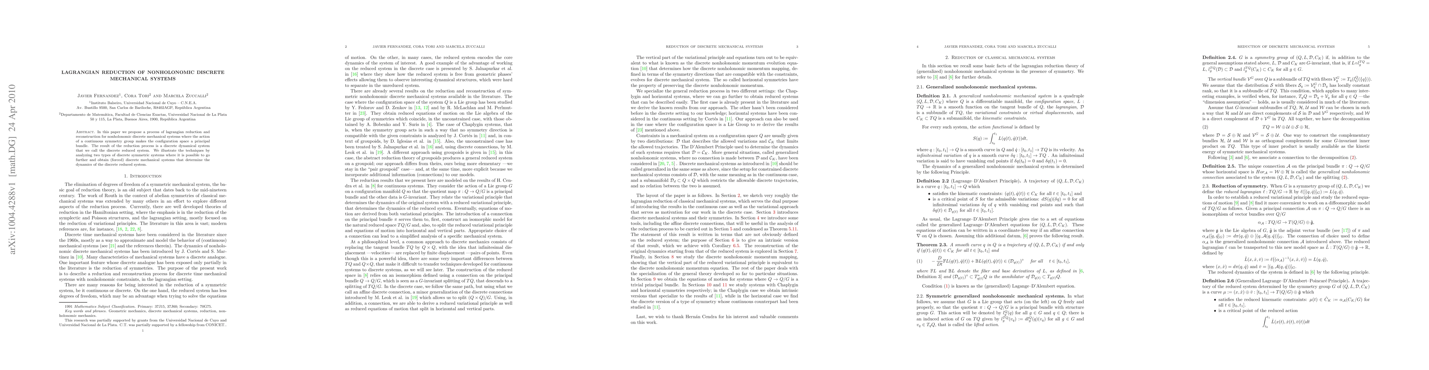 This paper introduces a method for reducing nonholonomic discrete mechanical systems using Lagrangian techniques, resulting in a discrete reduced system. The method is demonstrated through analysis of two types of symmetric systems, leading to forced discrete mechanical systems that dictate the dynamics of the reduced system.