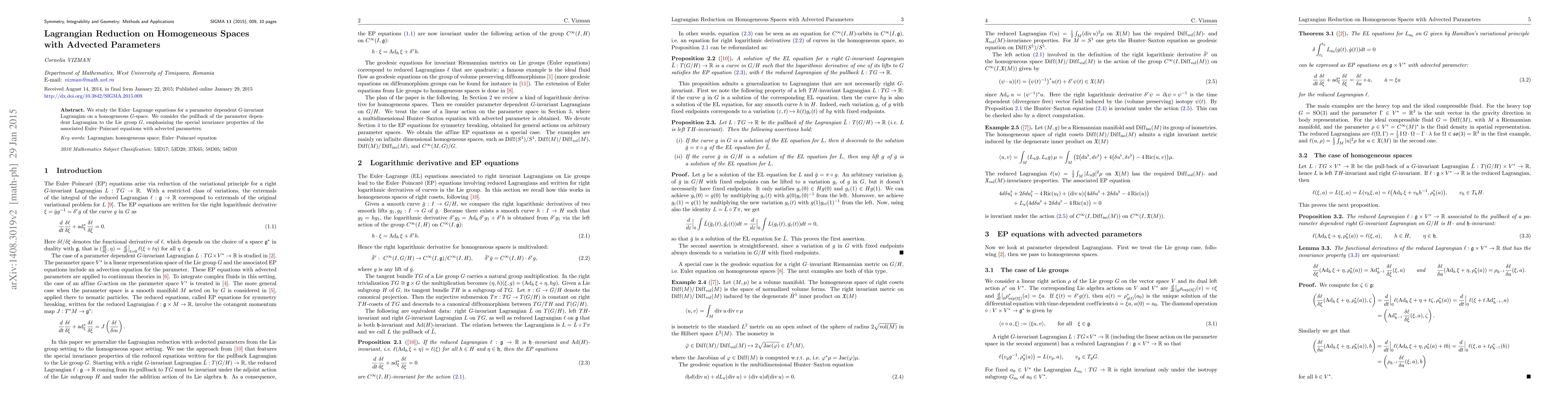 This paper investigates the Euler-Lagrange equations for a $G$-invariant Lagrangian on a homogeneous $G$-space, focusing on the advection of parameters and the resulting Euler-Poincaré equations when the Lagrangian is pulled back to the Lie group $G$.