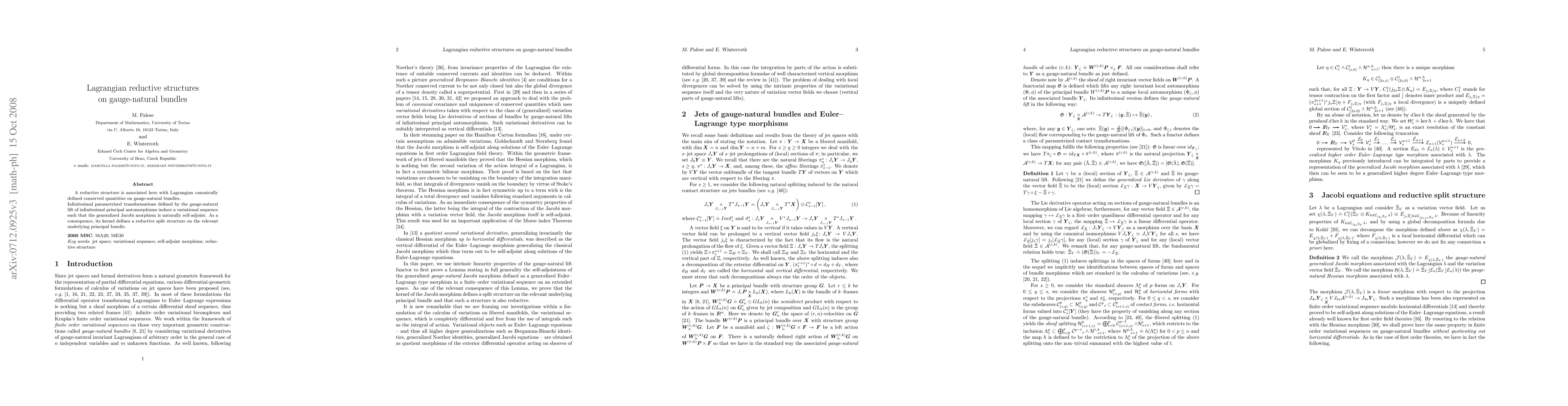 A reductive structure is associated here with Lagrangian canonically defined conserved quantities on gauge-natural bundles. Parametrized transformations defined by the gauge-natural lift of infinitesimal principal automorphisms induce a variational sequence such that the generalized Jacobi morphism is naturally self-adjoint. As a consequence, its kernel defines a reductive split structure on the relevant underlying principal bundle.