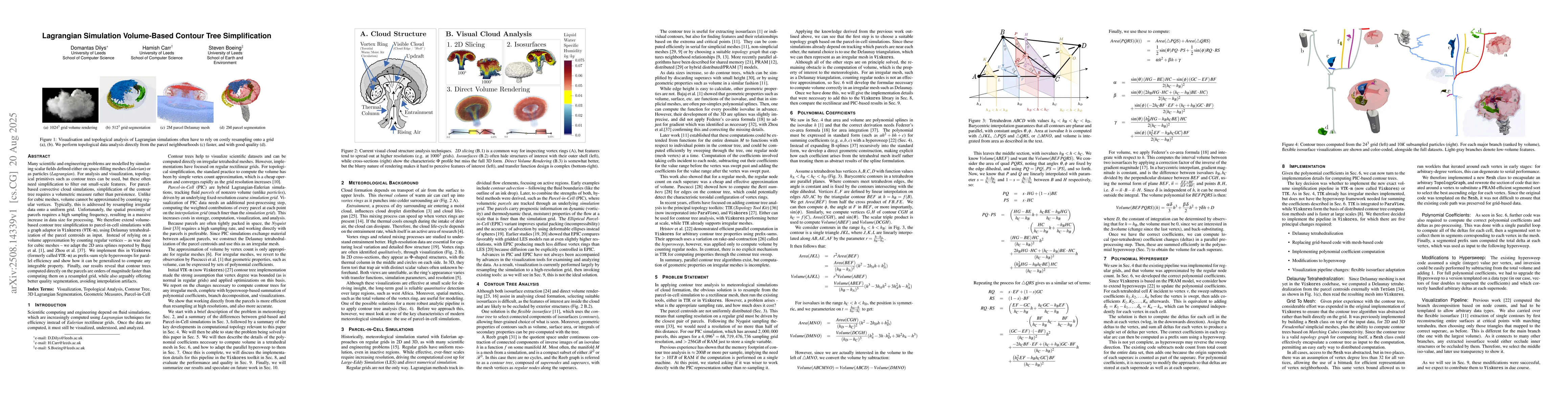 The paper introduces a volume-based contour tree simplification method for parcel-in-cell simulations, extending Viskores (VTK-m) with a graph adaptor for efficient processing of irregular data without resorting to grid resampling.