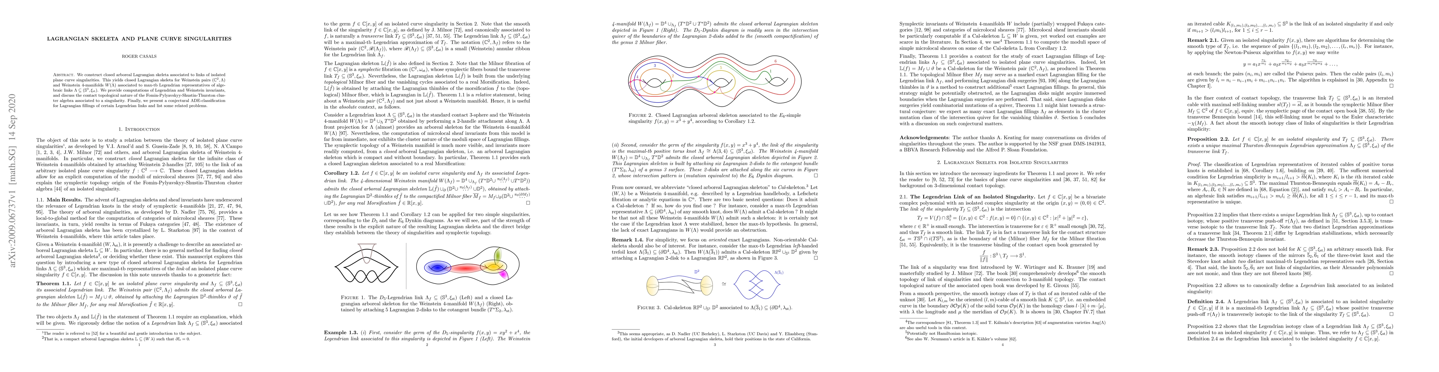 We construct closed arboreal Lagrangian skeleta associated to links of isolated plane curve singularities. This yields closed arboreal Lagrangian skeleta for Weinstein pairs and Weinstein 4-manifolds associated to max-tb Legendrian representatives of algebraic links. We provide computations of Legendrian and Weinstein invariants, and discuss the symplectic topological nature of the Fomin-Pylyavskyy-Shustin-Thurston cluster algebra associated to a singularity. Finally, we present a conjectural ADE-classification for Lagrangian fillings of certain Legendrian links and list some related problems.