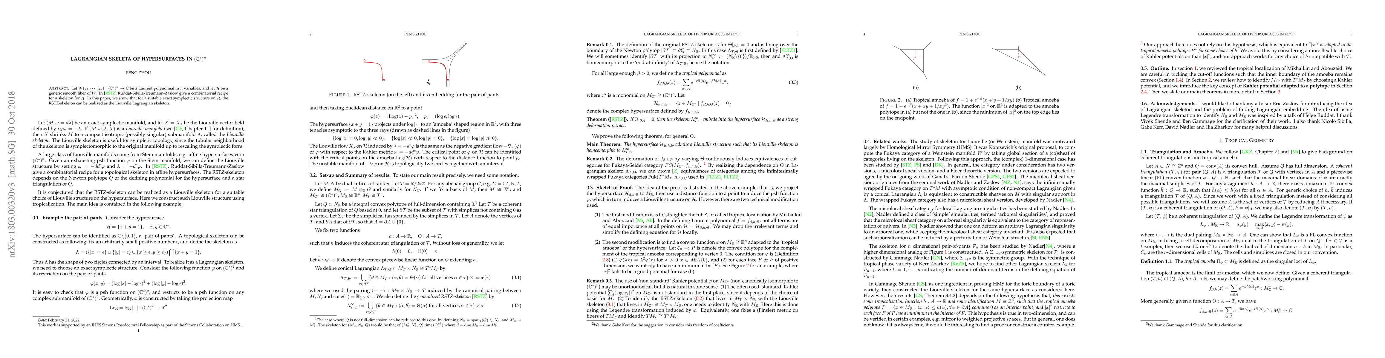 Let $W(z_1, \cdots, z_n): (\mathbb{C}^*)^n \to \mathbb{C}$ be a Laurent polynomial in $n$ variables, and let $\mathcal{H}$ be a generic smooth fiber of $W$. In \cite{RSTZ} Ruddat-Sibilla-Treumann-Zaslow give a combinatorial recipe for a skeleton for $\mathcal{H}$. In this paper, we show that for a suitable exact symplectic structure on $\mathcal{H}$, the RSTZ-skeleton can be realized as the Liouville Lagrangian skeleton.