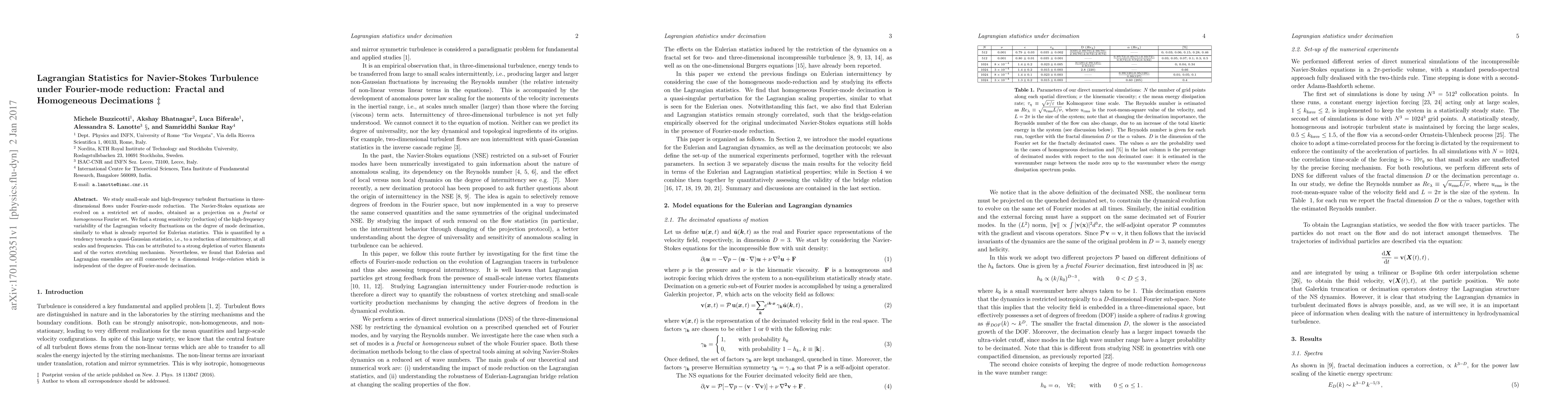 This paper investigates the impact of Fourier-mode reduction on Lagrangian statistics in turbulent flows governed by the Navier-Stokes equations, revealing a significant reduction in high-frequency variability and intermittency due to mode decimation. Despite this, a dimensional bridge-relation connects Eulerian and Lagrangian ensembles regardless of the degree of Fourier-mode reduction.