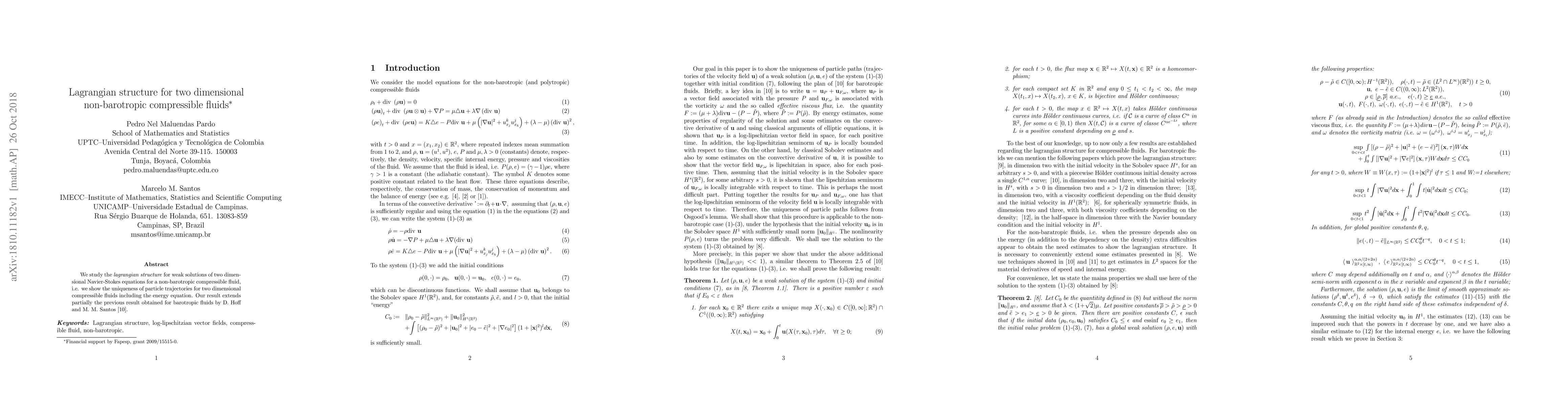 We study the lagrangian structure for weak solutions of two dimensional Navier-Stokes equations for a non-barotropic compressible fluid, i.e. we show the uniqueness of particle trajectories for two dimensional compressible fluids including the energy equation. Our result extends partially the result obtained for barotropic fluids by Hoff and Santos (2008).