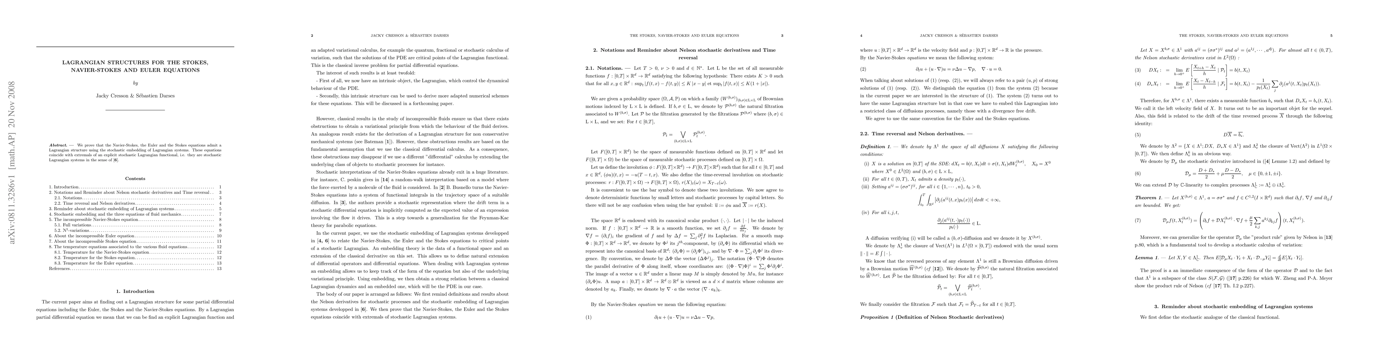 We prove that the Navier-Stokes, the Euler and the Stokes equations admit a Lagrangian structure using the stochastic embedding of Lagrangian systems. These equations coincide with extremals of an explicit stochastic Lagrangian functional, i.e. they are stochastic Lagrangian systems in the sense of [Cresson-Darses, J. Math. Phys. 48, 072703 (2007]