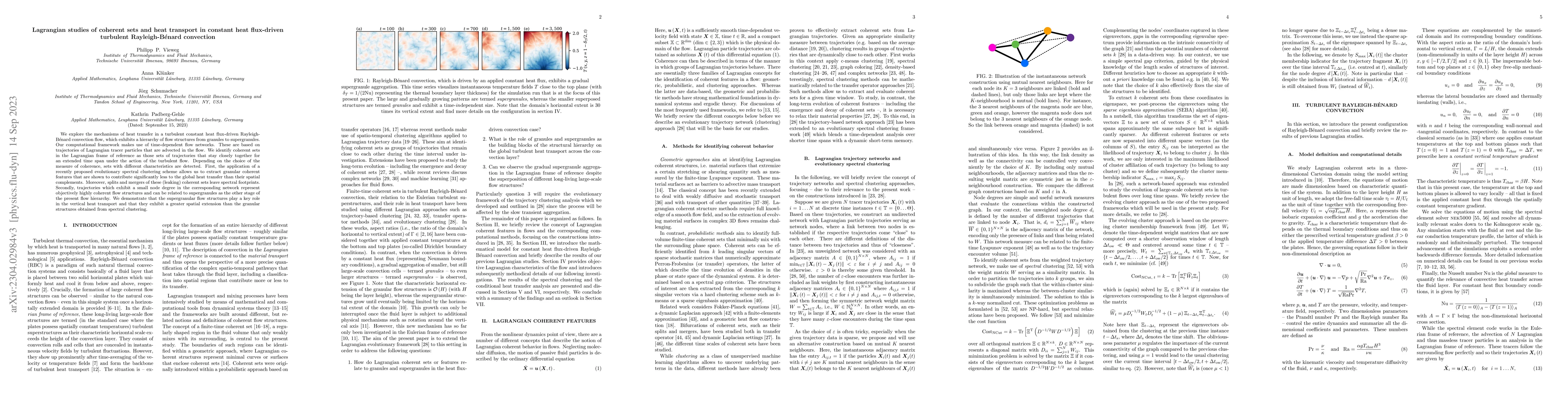We explore the mechanisms of heat transfer in a turbulent constant heat flux-driven Rayleigh-B\'enard convection flow, which exhibits a hierarchy of flow structures from granules to supergranules. Our computational framework makes use of time-dependent flow networks. These are based on trajectories of Lagrangian tracer particles that are advected in the flow. We identify coherent sets in the Lagrangian frame of reference as those sets of trajectories that stay closely together for an extended time span under the action of the turbulent flow. Depending on the choice of the measure of coherence, sets with different characteristics are detected. First, the application of a recently proposed evolutionary spectral clustering scheme allows us to extract granular coherent features that are shown to contribute significantly less to the global heat transfer than their spatial complements. Moreover, splits and mergers of these (leaking) coherent sets leave spectral footprints. Secondly, trajectories which exhibit a small node degree in the corresponding network represent objectively highly coherent flow structures and can be related to supergranules as the other stage of the present flow hierarchy. We demonstrate that the supergranular flow structures play a key role in the vertical heat transport and that they exhibit a greater spatial extension than the granular structures obtained from spectral clustering.