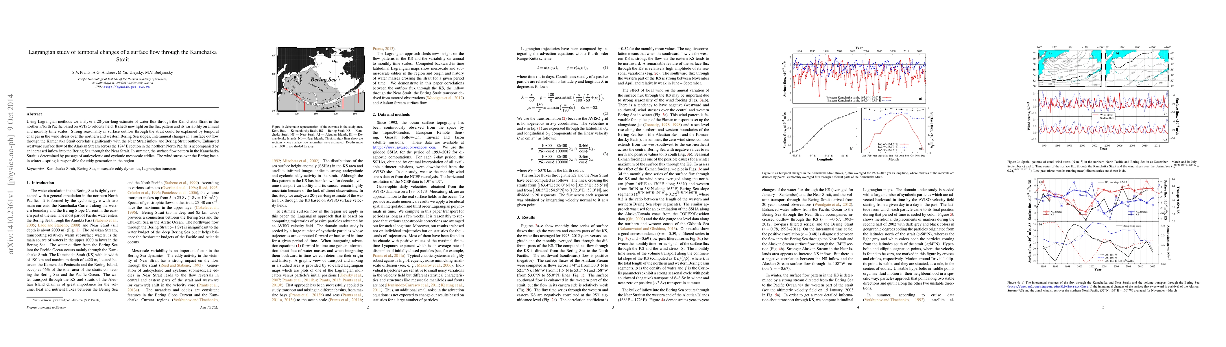 This study employs Lagrangian methods to analyze a 20-year dataset of water flux through the Kamchatka Strait, revealing strong seasonality and interannual variability linked to wind stress and mesoscale eddy dynamics. The findings highlight the influence of Alaskan Stream and Bering Sea inflows on the strait's surface outflow.