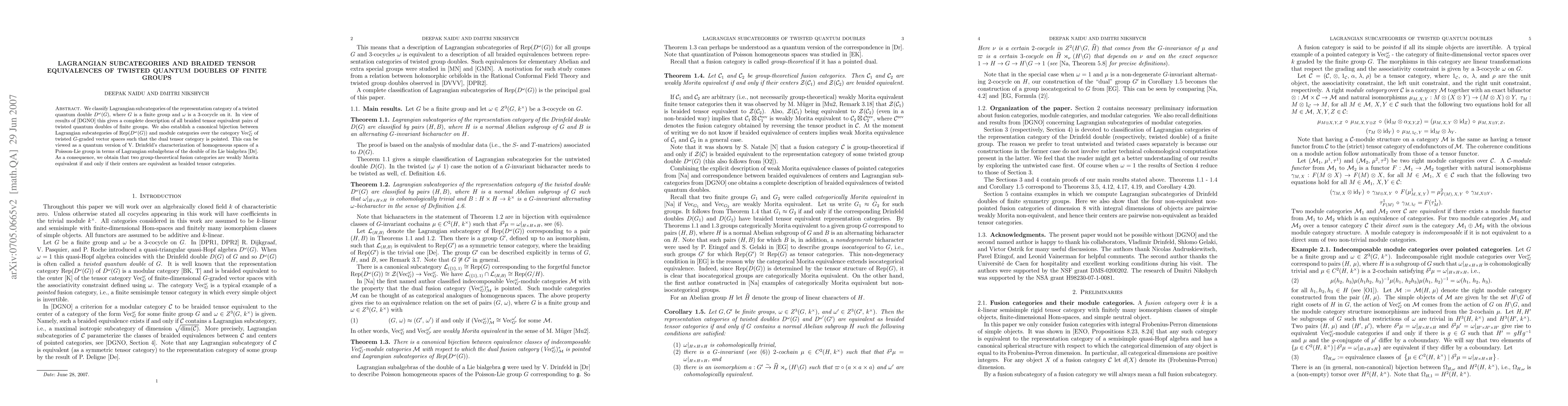 Summary: The paper classifies Lagrangian subcategories in the representation category of twisted quantum doubles of finite groups, providing a complete description of braided tensor equivalences between such doubles. It also establishes a bijection between these Lagrangian subcategories and module categories over twisted G-graded vector spaces, extending Drinfeld's characterization of homogeneous spaces.