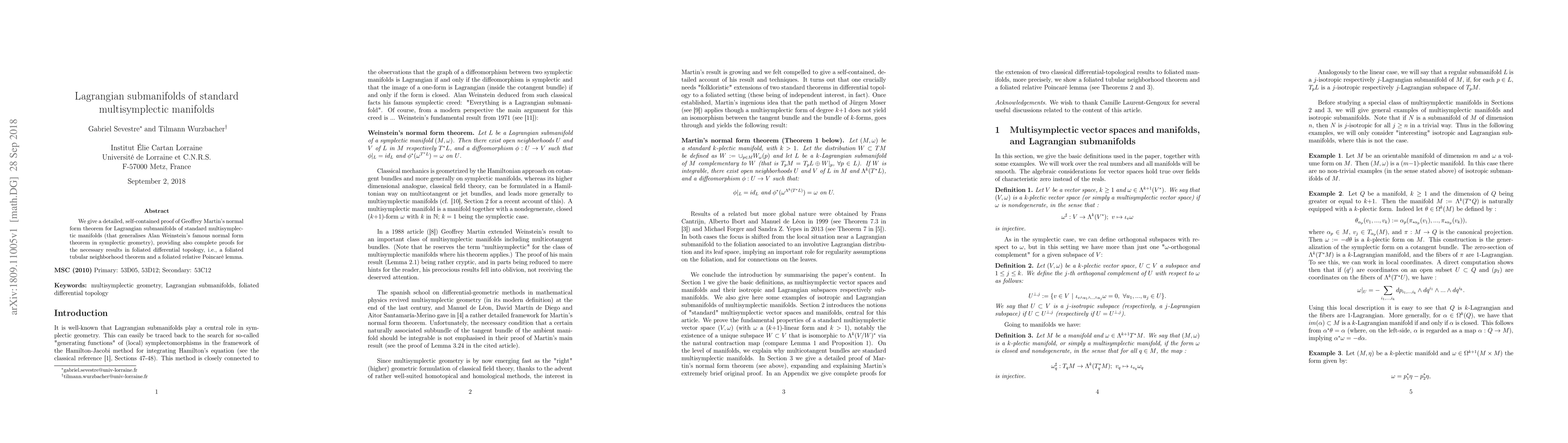 This paper proves Geoffrey Martin's normal form theorem for Lagrangian submanifolds of standard multisymplectic manifolds, providing key results in foliated differential topology.