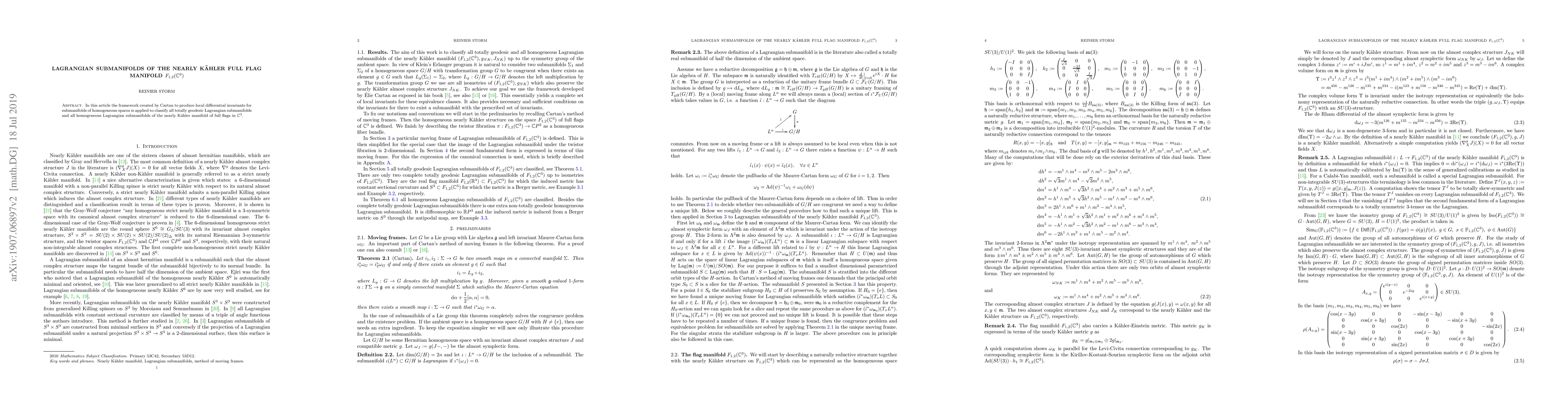 This research applies Cartan's framework to classify all totally geodesic and homogeneous Lagrangian submanifolds within the nearly Kähler full flag manifold $F_{1,2}(\mathbb{C}^3)$. The study focuses on using local differential invariants to achieve this classification.