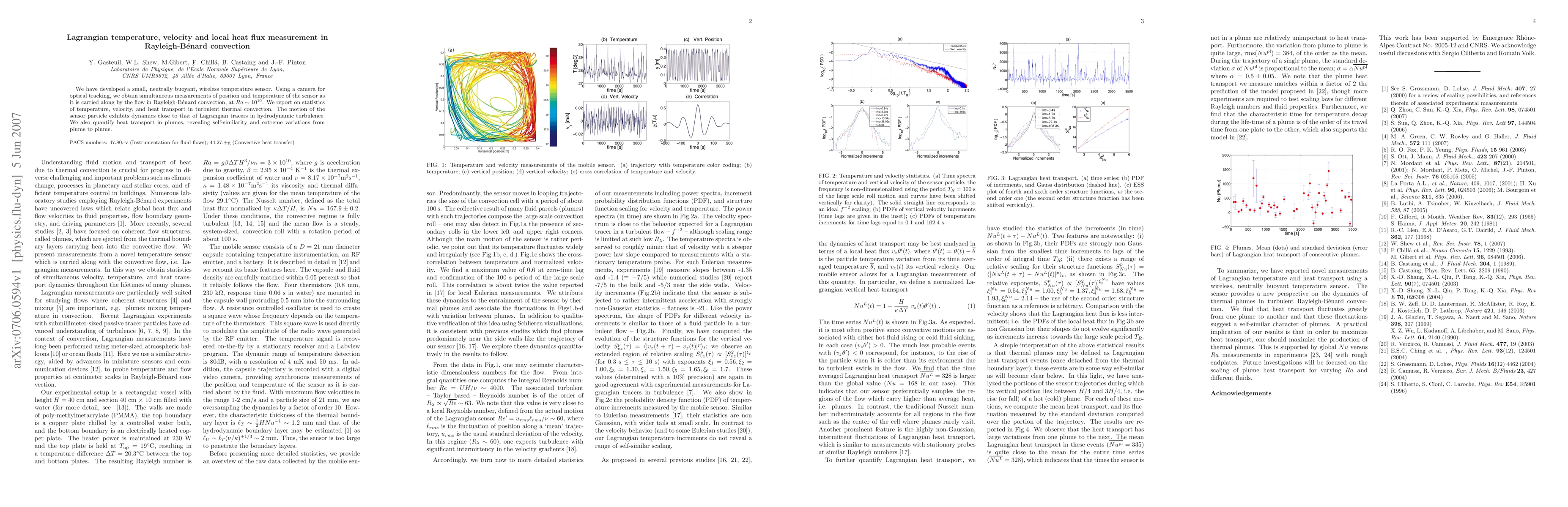 This study employs a small, wireless temperature sensor to measure Lagrangian temperature, velocity, and local heat flux in Rayleigh-Bénard convection at $Ra \sim 10^{10}$. The sensor's motion reveals dynamics similar to Lagrangian tracers, and it uncovers self-similar yet highly variable heat transport in convective plumes.