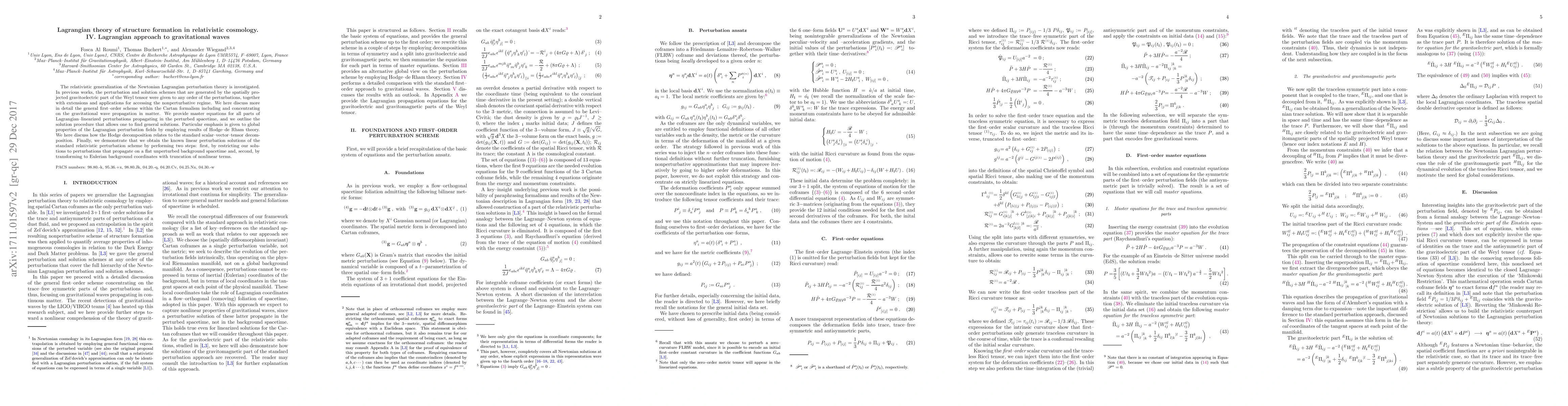 This paper extends the Lagrangian perturbation theory to relativistic cosmology, focusing on the first-order scheme within the Cartan formalism. It provides master equations for gravitational wave propagation in matter and demonstrates the connection between the Hodge decomposition and the standard scalar-vector-tensor decomposition, ultimately showing equivalence to the standard relativistic perturbation scheme.