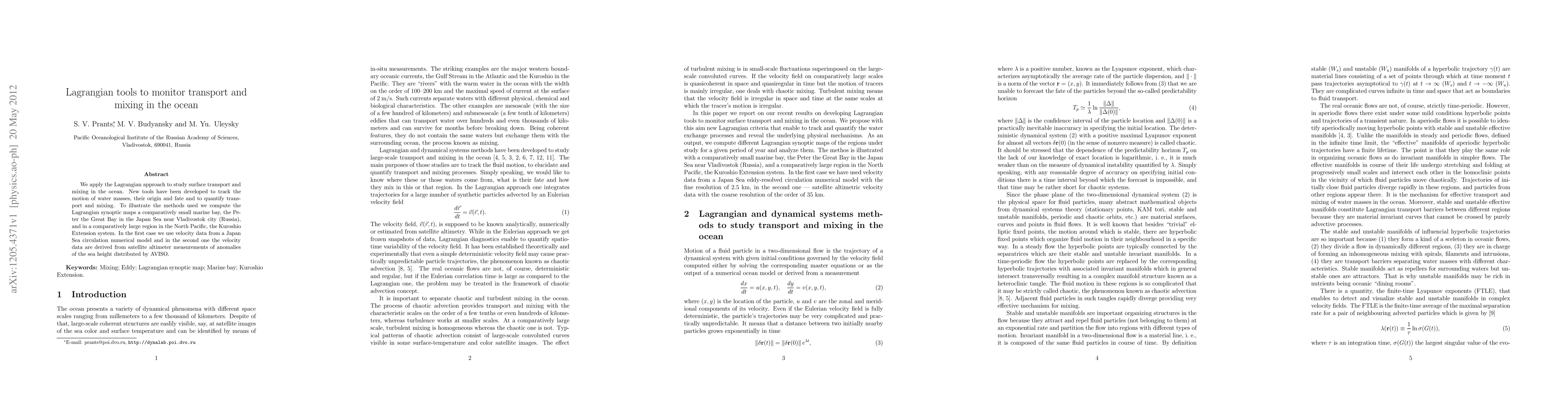 This paper introduces Lagrangian tools for tracking ocean surface transport and mixing, applying them to Peter the Great Bay and the Kuroshio Extension. It uses a Japan Sea circulation model and satellite altimetry data to illustrate these new methods.