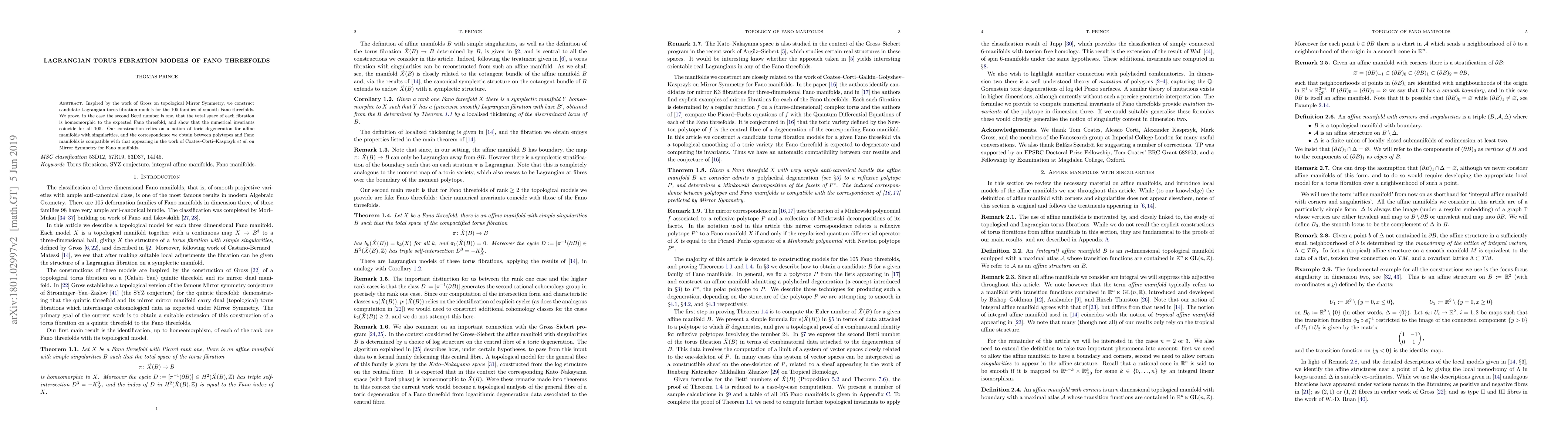 Inspired by the work of Gross on topological Mirror Symmetry we construct candidate Lagrangian torus fibration models for the 105 families of smooth Fano threefolds. We prove, in the case the second Betti number is one, that the total space of each fibration is homeomorphic to the expected Fano threefold, and show that the numerical invariants coincide for all 105. Our construction relies on a notion of toric degeneration for affine manifolds with singularities, and the correspondence we obtain between polytopes and Fano manifolds is compatible with that appearing in the work of Coates-Corti-Kasprzyk et al. on Mirror Symmetry for Fano manifolds.
