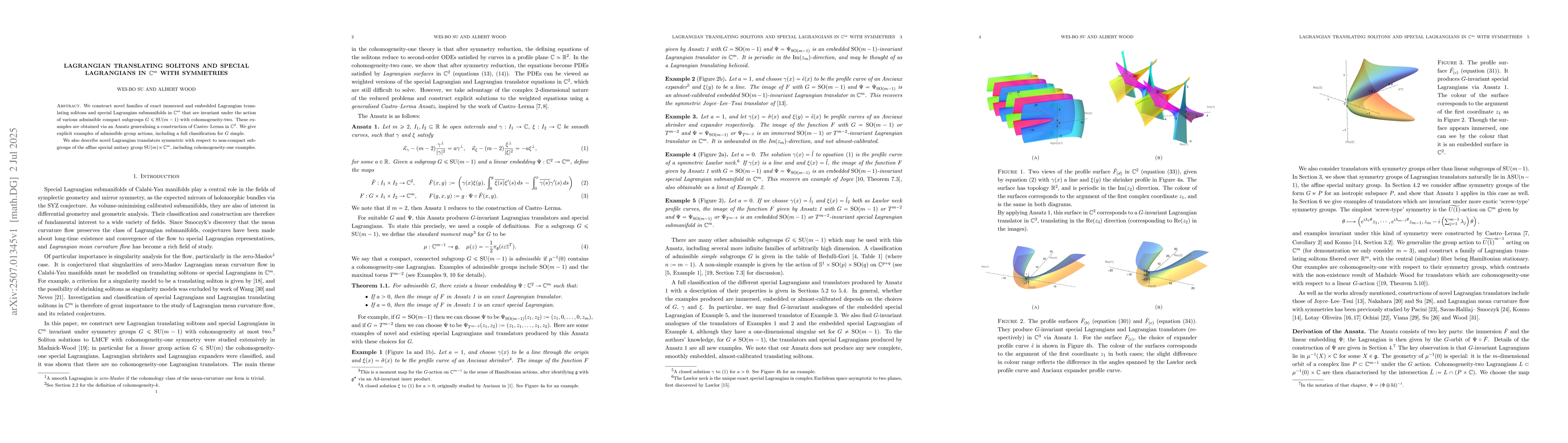 We construct novel families of exact immersed and embedded Lagrangian translating solitons and special Lagrangian submanifolds in $\mathbb{C}^m$ that are invariant under the action of various admissible compact subgroups $G \leq \text{SU}(m-1)$ with cohomogeneity-two. These examples are obtained via an Ansatz generalising a construction of Castro-Lerma in $\mathbb{C}^2$. We give explicit examples of admissible group actions, including a full classification for $G$ simple. We also describe novel Lagrangian translators symmetric with respect to non-compact subgroups of the affine special unitary group $\text{SU}(m)\ltimes \mathbb{C}^m$, including cohomogeneity-one examples.