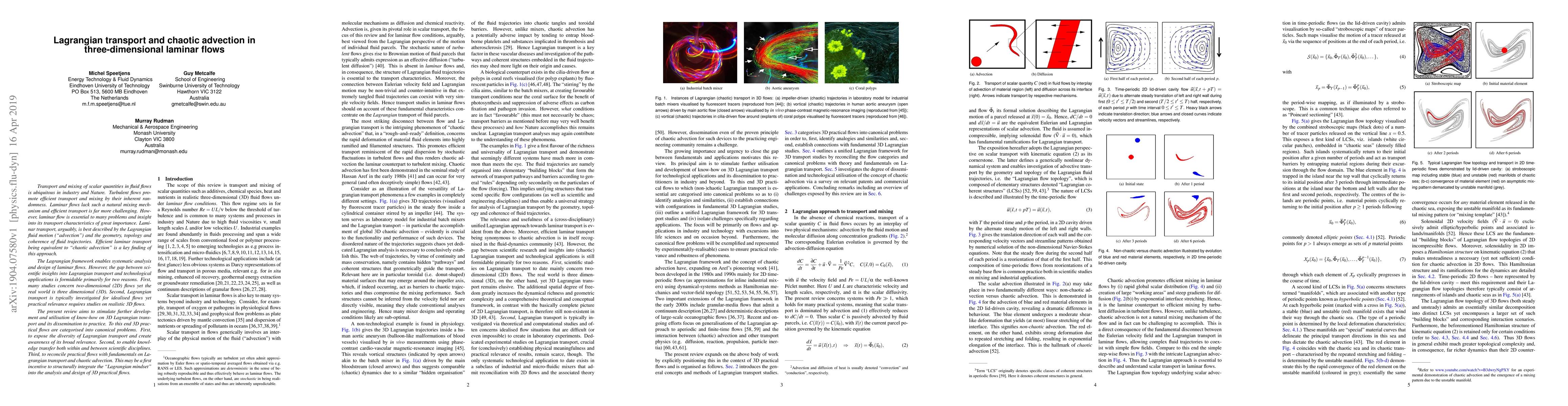 This paper reviews the Lagrangian transport and chaotic advection in three-dimensional laminar flows, highlighting the challenges in practical applications due to the focus on two-dimensional studies and idealised flows. It categorizes practical 3D flows to promote awareness, knowledge transfer, and integration of Lagrangian insights into the analysis and design of real-world flows.