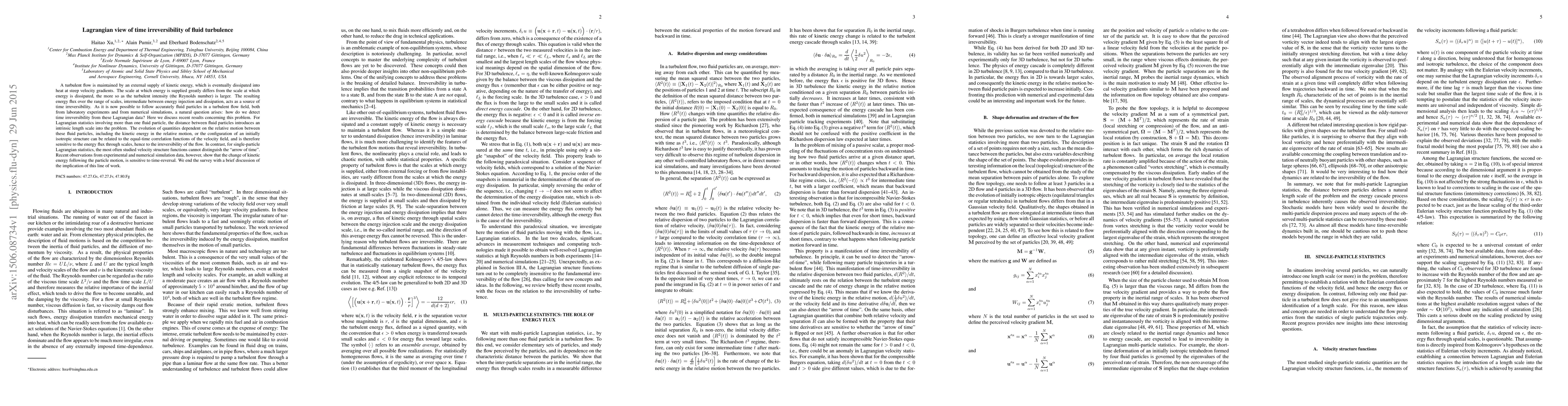 A turbulent flow is maintained by an external supply of kinetic energy, which is eventually dissipated into heat at steep velocity gradients. The scale at which energy is supplied greatly differs from the scale at which energy is dissipated, the more so as the turbulent intensity (the Reynolds number) is larger. The resulting energy flux over the range of scales, intermediate between energy injection and dissipation, acts as a source of time irreversibility. As it is now possible to follow accurately fluid particles in a turbulent flow field, both from laboratory experiments and from numerical simulations, a natural question arises: how do we detect time irreversibility from these Lagrangian data? Here we discuss recent results concerning this problem. For Lagrangian statistics involving more than one fluid particle, the distance between fluid particles introduces an intrinsic length scale into the problem. The evolution of quantities dependent on the relative motion between these fluid particles, including the kinetic energy in the relative motion, or the configuration of an initially isotropic structure can be related to the equal-time correlation functions of the velocity field, and is therefore sensitive to the energy flux through scales, hence to the irreversibility of the flow. In contrast, for single-particle Lagrangian statistics, the most often studied velocity structure functions cannot distinguish the "arrow of time." Recent observations from experimental and numerical simulation data, however, show that the change of kinetic energy following the particle motion, is sensitive to time-reversal. We end the survey with a brief discussion of the implication of this line of work.