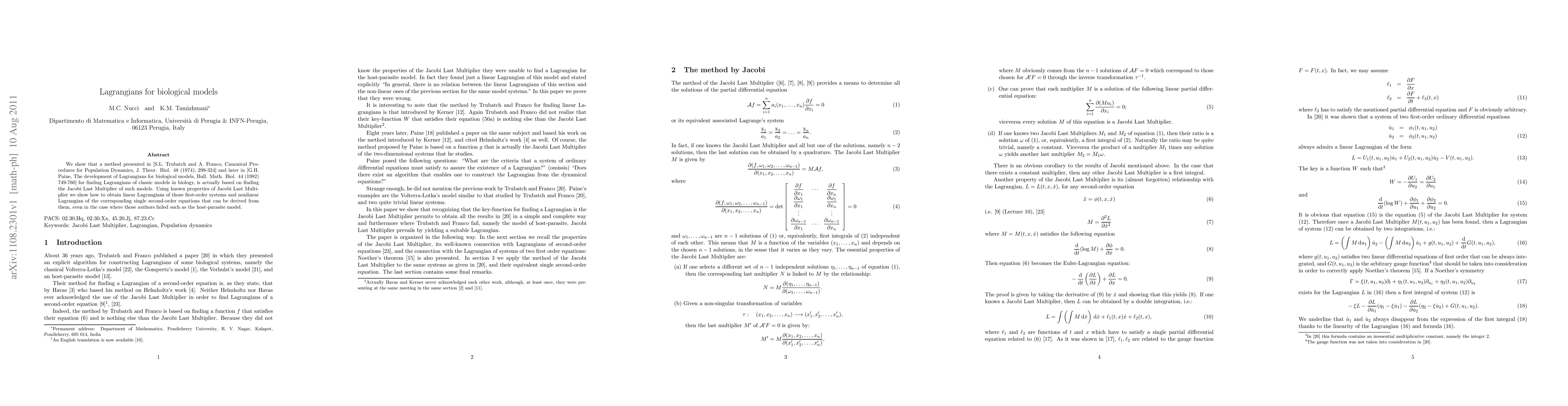This paper demonstrates that the method for finding Lagrangians in biological models, originally developed by Trubatch and Franco, and later expanded by Paine, is fundamentally based on identifying the Jacobi Last Multiplier. It shows how to derive linear Lagrangians for first-order systems and nonlinear Lagrangians for second-order equations derived from them, even in cases previously deemed intractable.