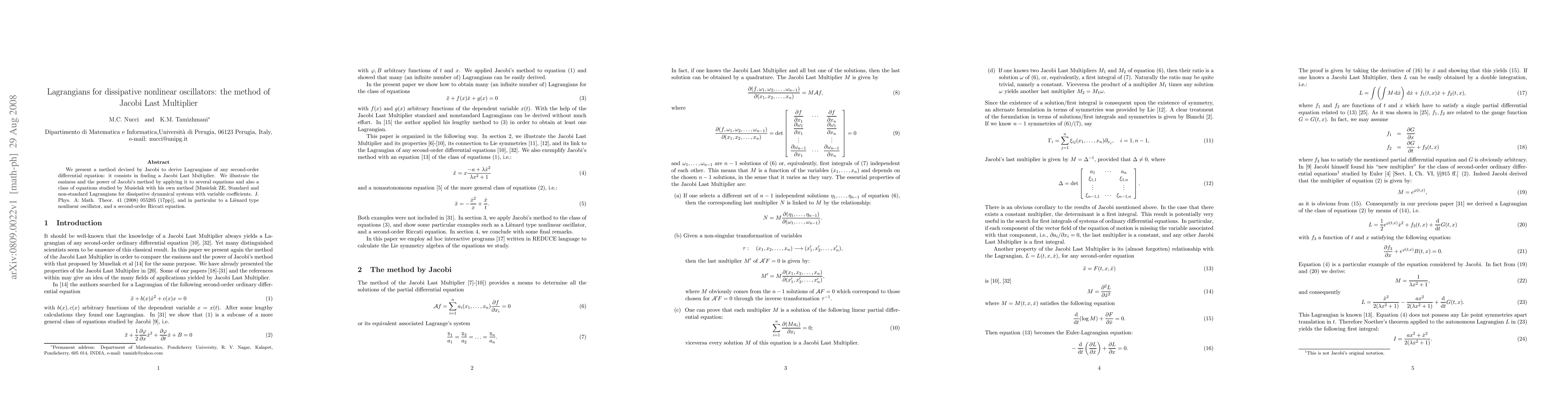This paper introduces Jacobi's method for deriving Lagrangians for second-order differential equations by using a Jacobi Last Multiplier. The method is demonstrated through its application to various equations, including those studied by Musielak and specifically to a Liénard type nonlinear oscillator and a second-order Riccati equation.