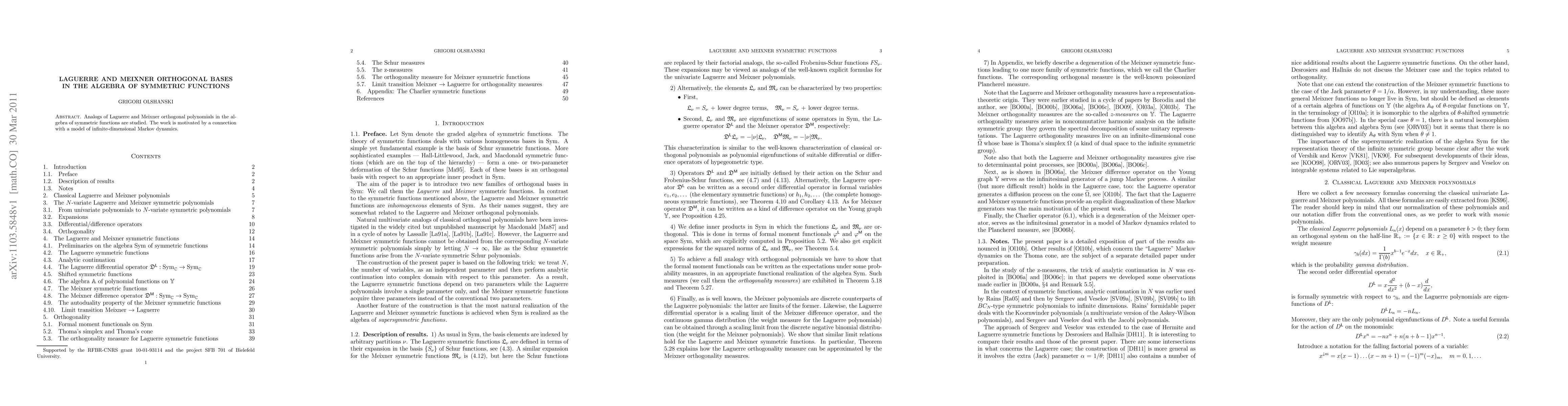 Analogs of Laguerre and Meixner orthogonal polynomials in the algebra of symmetric functions are studied. This is a detailed exposition of part of the results announced in arXiv:1009.2037. The work is motivated by a connection with a model of infinite-dimensional Markov dynamics.