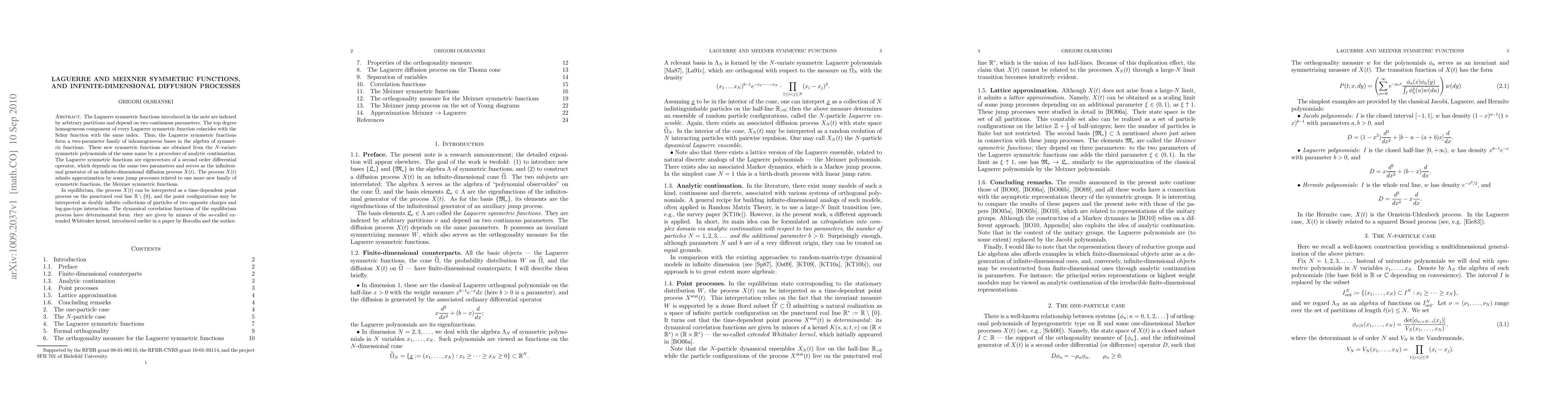 The Laguerre symmetric functions introduced in the note are indexed by arbitrary partitions and depend on two continuous parameters. The top degree homogeneous component of every Laguerre symmetric function coincides with the Schur function with the same index. Thus, the Laguerre symmetric functions form a two-parameter family of inhomogeneous bases in the algebra of symmetric functions. These new symmetric functions are obtained from the N-variate symmetric polynomials of the same name by a procedure of analytic continuation. The Laguerre symmetric functions are eigenvectors of a second order differential operator, which depends on the same two parameters and serves as the infinitesimal generator of an infinite-dimensional diffusion process X(t). The process X(t) admits approximation by some jump processes related to one more new family of symmetric functions, the Meixner symmetric functions. In equilibrium, the process X(t) can be interpreted as a time-dependent point process on the punctured real line R\{0}, and the point configurations may be interpreted as doubly infinite collections of particles of two opposite charges with log-gas-type interaction. The dynamical correlation functions of the equilibrium process have determinantal form: they are given by minors of the so-called extended Whittaker kernel, introduced earlier in a paper by Borodin and the author.