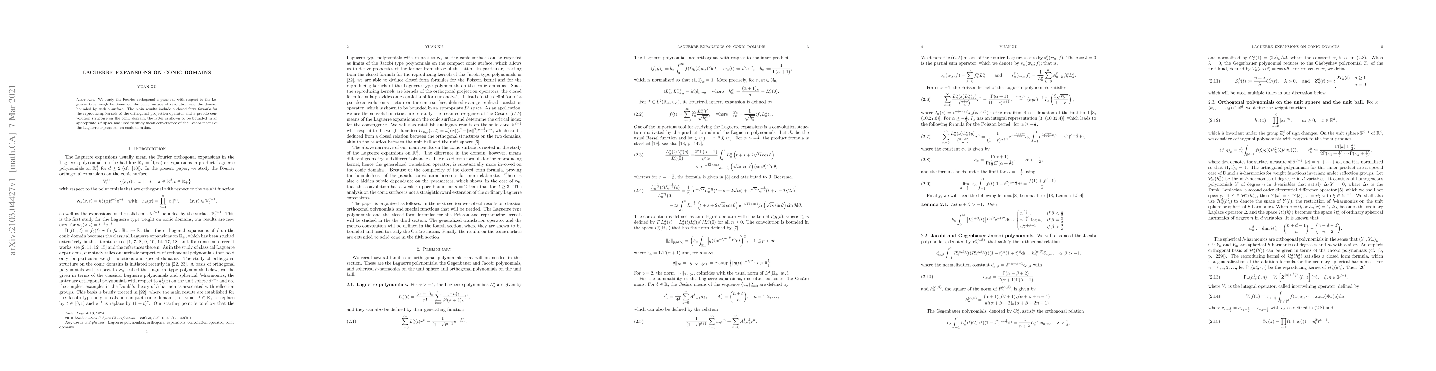 We study the Fourier orthogonal expansions with respect to the Laguerre type weigh functions on the conic surface of revolution and the domain bounded by such a surface. The main results include a closed form formula for the reproducing kernels, which is the kernel of the orthogonal projection operator and a pseudo convolution structure on the conic domain; the latter is shown to be bounded in an appropriate $L^p$ space and used to study mean convergence of the Ces\`aro means of the Laguerre expansions on conic domains.