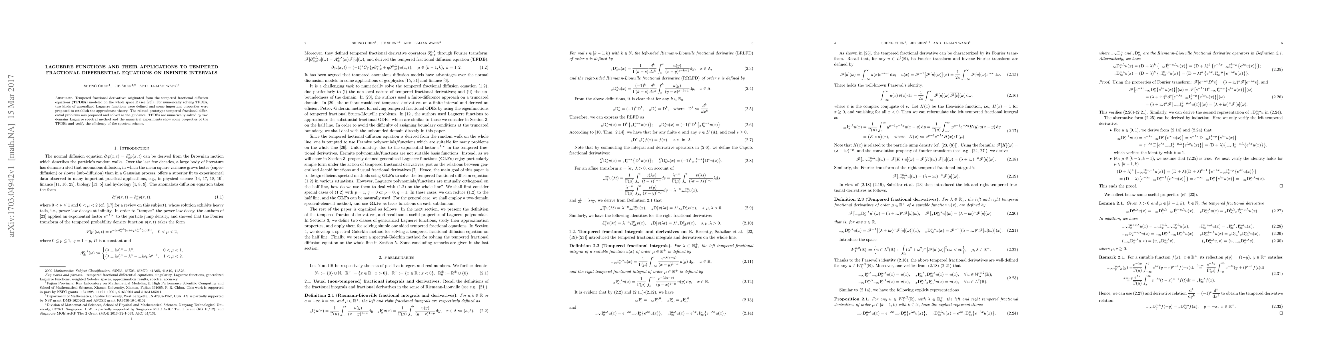 Tempered fractional derivatives originated from the tempered fractional diffusion equations (TFDEs) modeled on the whole space R (see [23]). For numerically solving TFDEs, two kinds of generalized Laguerre functions were defined and some important properties were proposed to establish the approximate theory. The related prototype tempered fractional differ- ential problems was proposed and solved as the guidance. TFDEs are numerically solved by two domains Laguerre spectral method and the numerical experiments show some properties of the TFDEs and verify the efficiency of the spectral scheme.