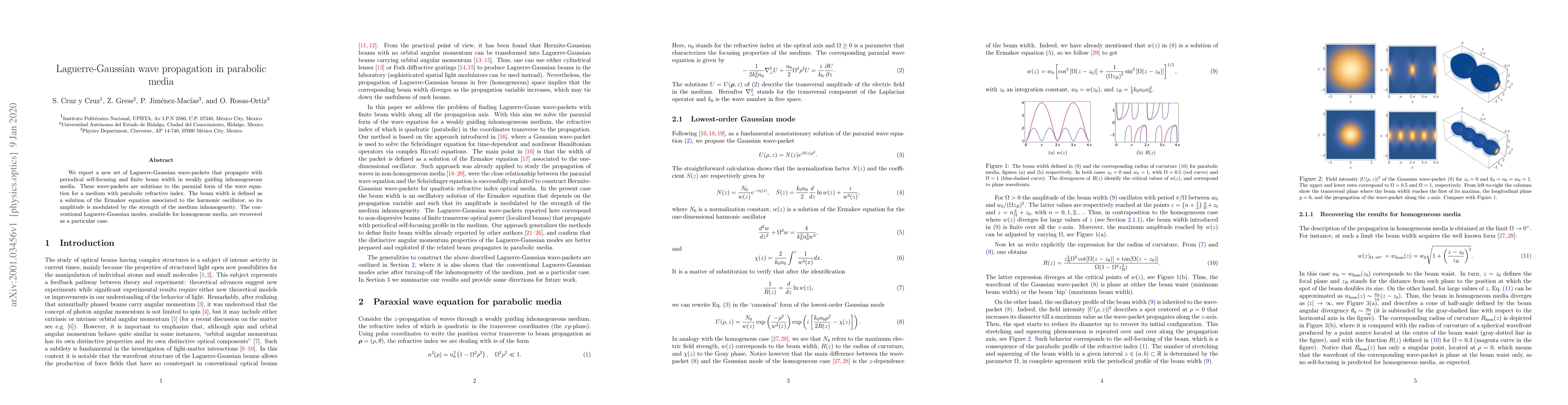 The paper introduces a new set of Laguerre-Gaussian wave-packet solutions for parabolic media, characterized by periodic self-focusing and finite beam width, and derives their properties using the Ermakov equation.