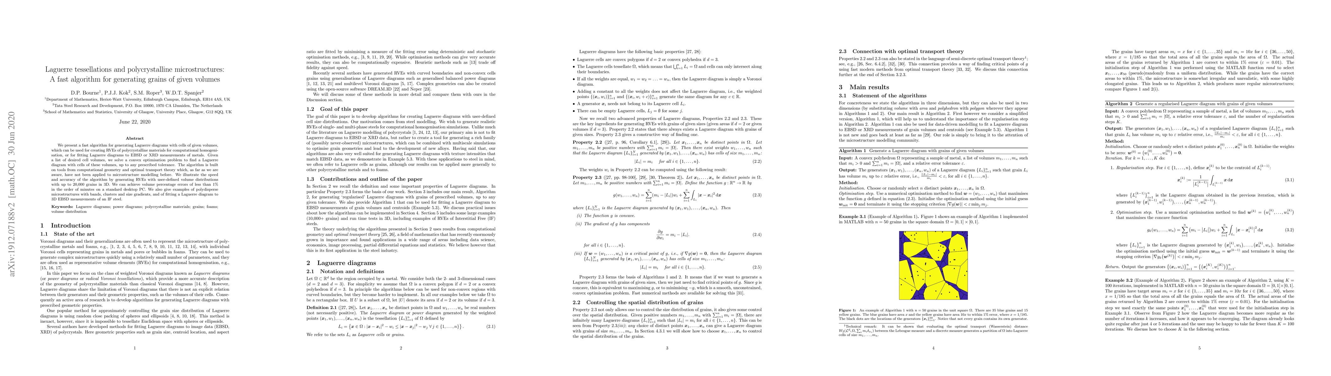 We present a fast algorithm for generating Laguerre diagrams with cells of given volumes, which can be used for creating RVEs of polycrystalline materials for computational homogenisation, or for fitting Laguerre diagrams to EBSD or XRD measurements of metals. Given a list of desired cell volumes, we solve a convex optimisation problem to find a Laguerre diagram with cells of these volumes, up to any prescribed tolerance. The algorithm is built on tools from computational geometry and optimal transport theory which, as far as we are aware, have not been applied to microstructure modelling before. We illustrate the speed and accuracy of the algorithm by generating RVEs with user-defined volume distributions with up to 20,000 grains in 3D. We can achieve volume percentage errors of less than 1% in the order of minutes on a standard desktop PC. We also give examples of polydisperse microstructures with bands, clusters and size gradients, and of fitting a Laguerre diagram to 3D EBSD measurements of an IF steel.