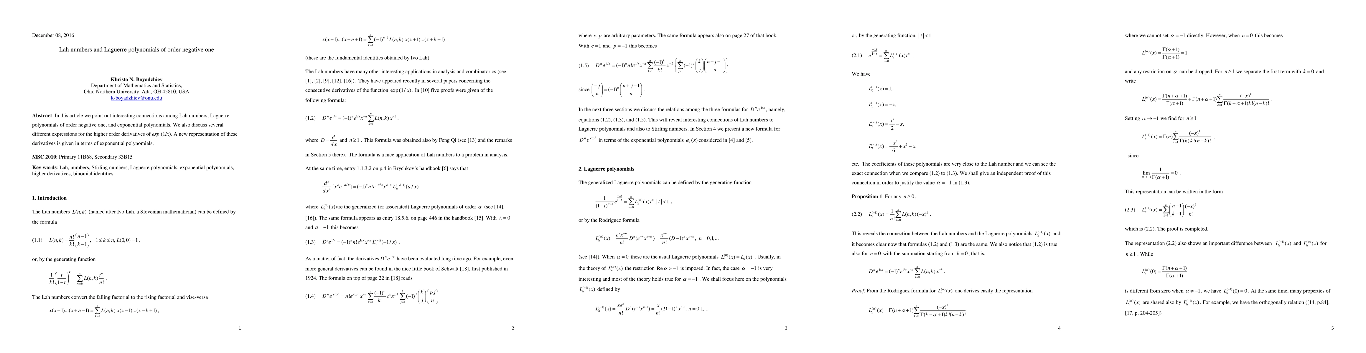 In this article we point out interesting connections among Lah numbers, Laguerre polynomials of order negative one, and exponential polynomials. We also discuss several different expressions for the higher order derivatives of exp (1/x). A new representation of these derivatives is given in terms of exponential polynomials