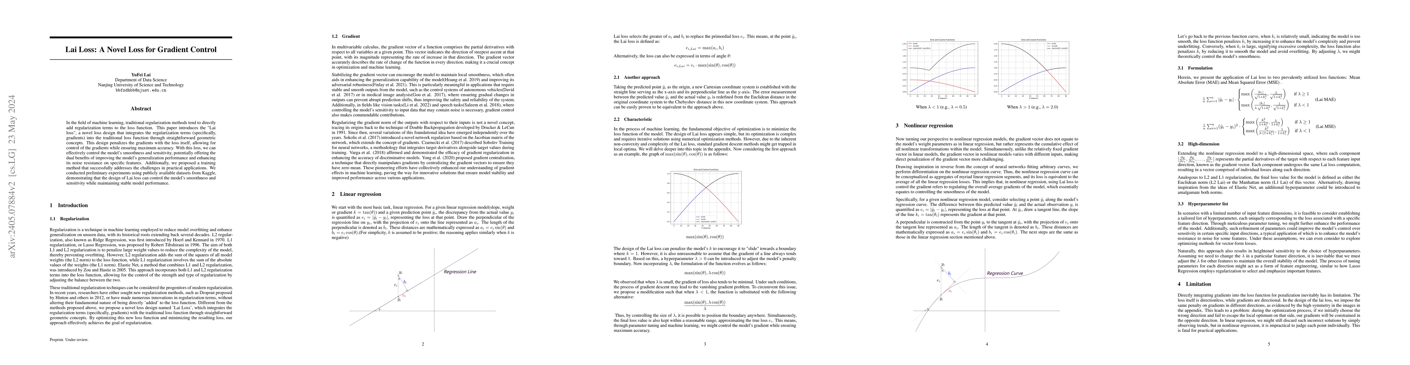 Title: Lai Loss: A Novel Loss for Gradient Control Summary: This paper introduces Lai loss, a new approach for integrating regularization into the loss function by penalizing gradients, aiming to control model smoothness and sensitivity while enhancing generalization and noise resistance, supported by initial experiments on Kaggle datasets.