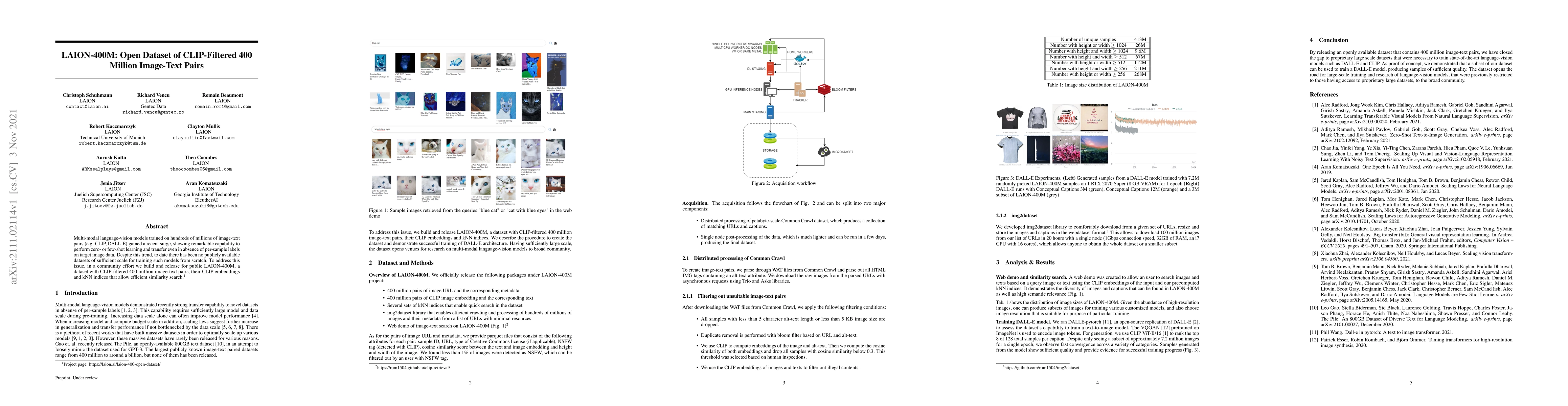 A new dataset called LAION-400M has been released to support training of multi-modal language-vision models from scratch. It contains 400 million image-text pairs, their CLIP embeddings, and kNN indices for efficient similarity search.