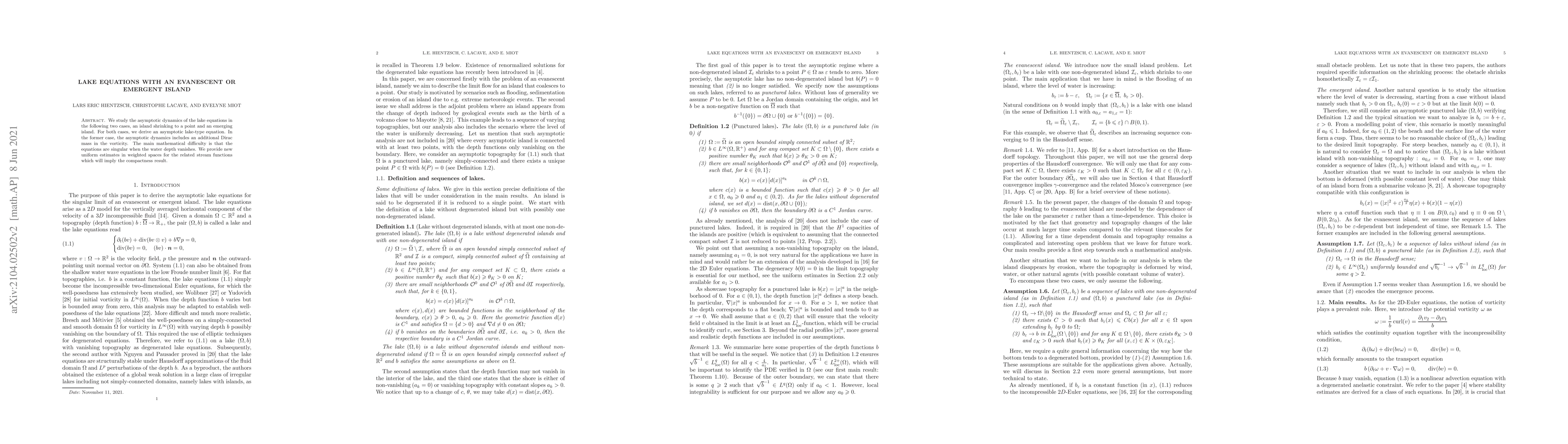 This paper investigates the asymptotic behavior of the lake equations when an island either shrinks to a point or emerges, deriving an asymptotic lake-type equation for both scenarios. It addresses the singular nature of the equations when water depth vanishes, providing new uniform estimates to establish compactness results.