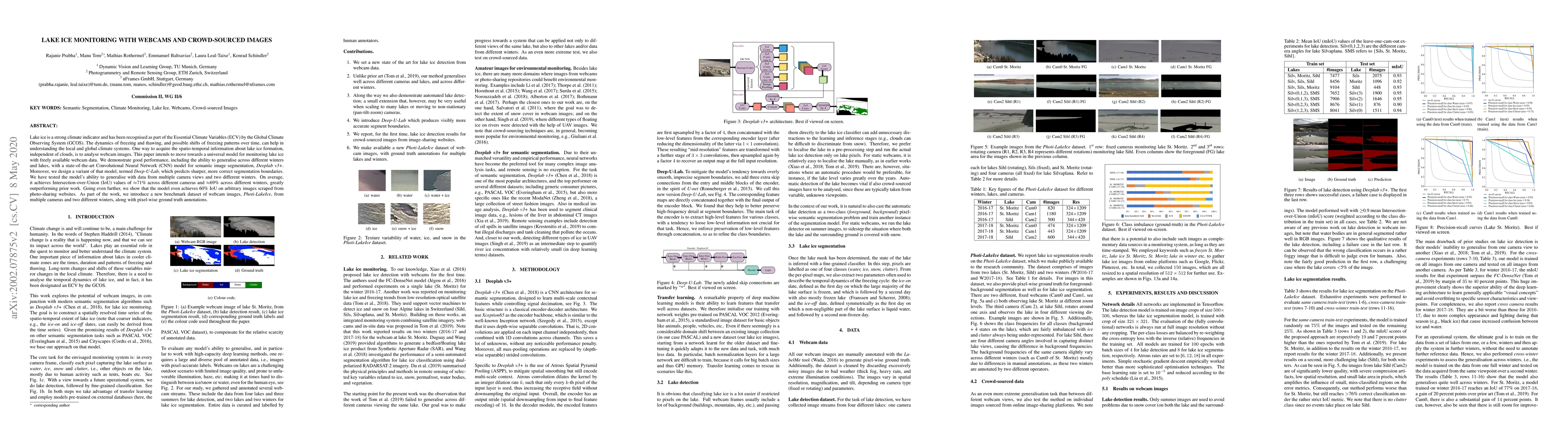 This paper develops a Convolutional Neural Network (CNN) model, Deeplab v3+ and its variant Deep-U-Lab, for monitoring lake ice using webcam and crowd-sourced images, achieving high accuracy and generalization across different winters and lakes. The study introduces a new benchmark dataset, Photi-LakeIce, to facilitate further research.