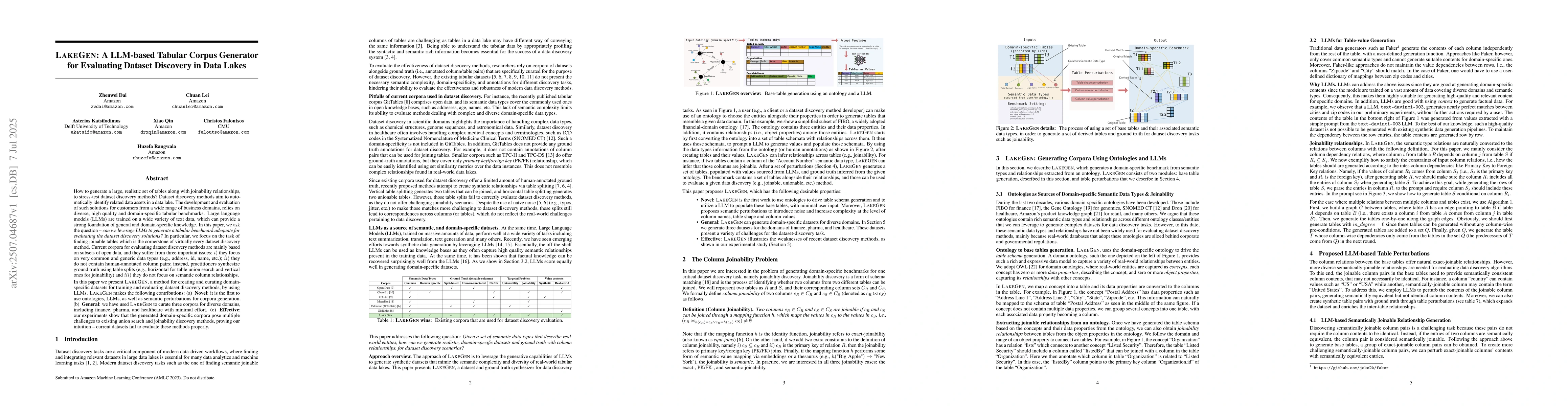 How to generate a large, realistic set of tables along with joinability relationships, to stress-test dataset discovery methods? Dataset discovery methods aim to automatically identify related data assets in a data lake. The development and evaluation of such solutions for customers from a wide range of business domains, relies on diverse, high quality and domain-specific tabular benchmarks. Large language models (LLMs) are trained on a wide variety of text data, which can provide a strong foundation of general and domain-specific knowledge. In this paper, we ask the question -- \textit{can we leverage LLMs to generate a tabular benchmark adequate for evaluating the dataset discovery solutions?} In particular, we focus on the task of finding joinable tables which is the cornerstone of virtually every dataset discovery method. Current corpora for evaluating dataset discovery methods are mainly based on subsets of open data, and they suffer from three important issues: $i)$ they focus on very common and generic data types (e.g., address, id, name, etc.); $ii)$ they do not contain human-annotated column pairs; instead, practitioners synthesize ground truth using table splits (e.g., horizontal for table union search and vertical ones for joinability) and $iii)$ they do not focus on semantic column relationships.