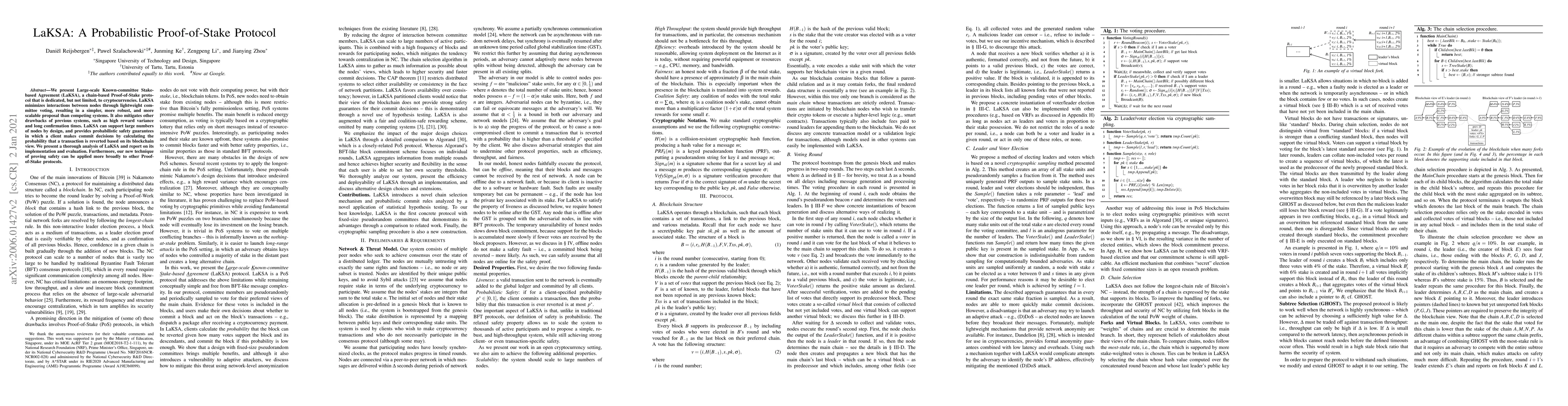 LaKSA is a scalable Proof-of-Stake protocol designed to enhance cryptocurrency networks through lightweight committee voting, reducing node interactions and improving efficiency. It offers probabilistic safety guarantees and addresses issues like high reward variance and long confirmation times.