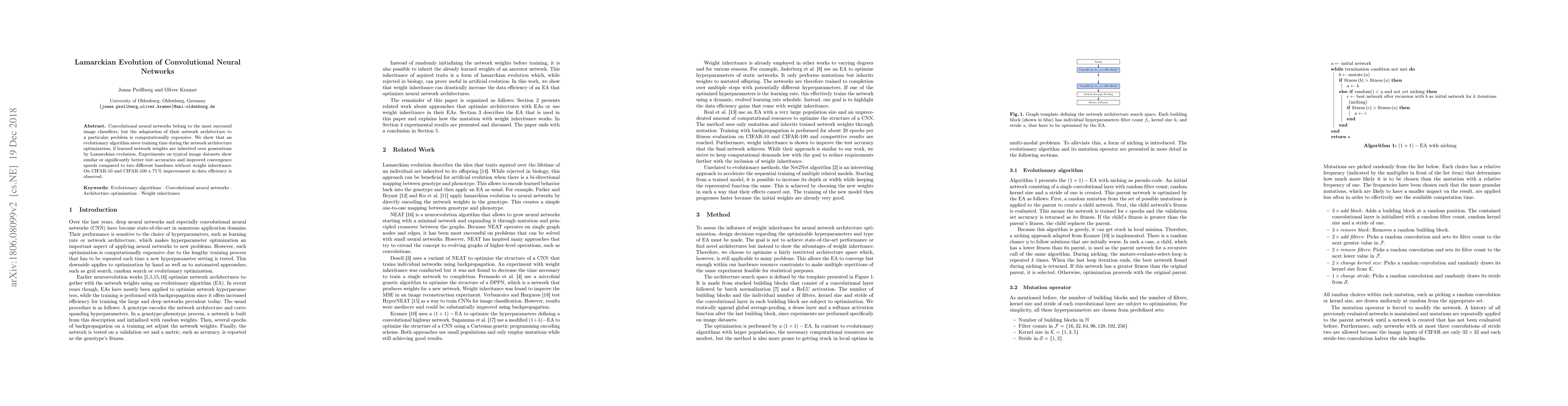 This paper demonstrates that using Lamarckian evolution in convolutional neural networks (CNNs) can significantly reduce training time and improve data efficiency during architecture optimization, achieving comparable or superior test accuracies and faster convergence compared to baseline methods. The method shows a 75% improvement in data efficiency on CIFAR-10 and CIFAR-100 datasets.
