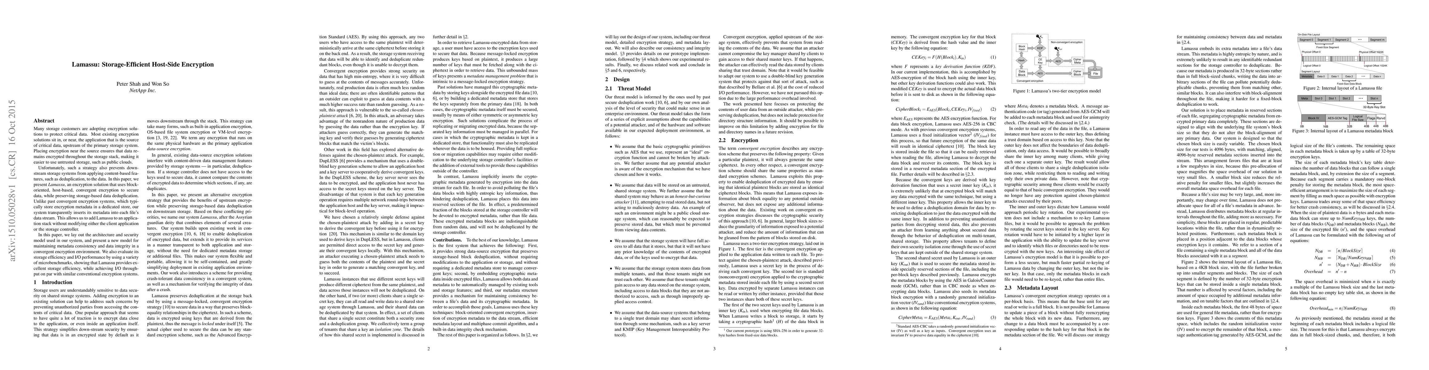 Lamassu presents a host-side encryption solution that enables storage-based deduplication while ensuring data security, by embedding encryption metadata directly into the data stream without requiring application or storage controller modifications. The system demonstrates high storage efficiency and comparable I/O performance to traditional encryption methods.