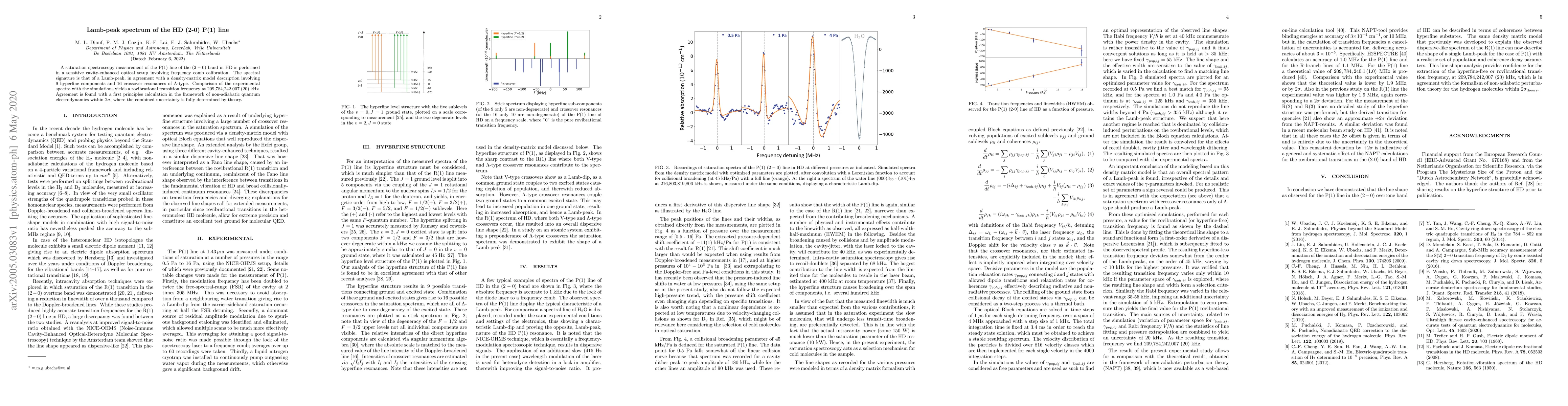 Researchers measured the HD (2-0) P(1) line using saturation spectroscopy and found a Lamb-peak spectrum in agreement with density-matrix model predictions, yielding a transition frequency of 209,784,242,007 kHz.