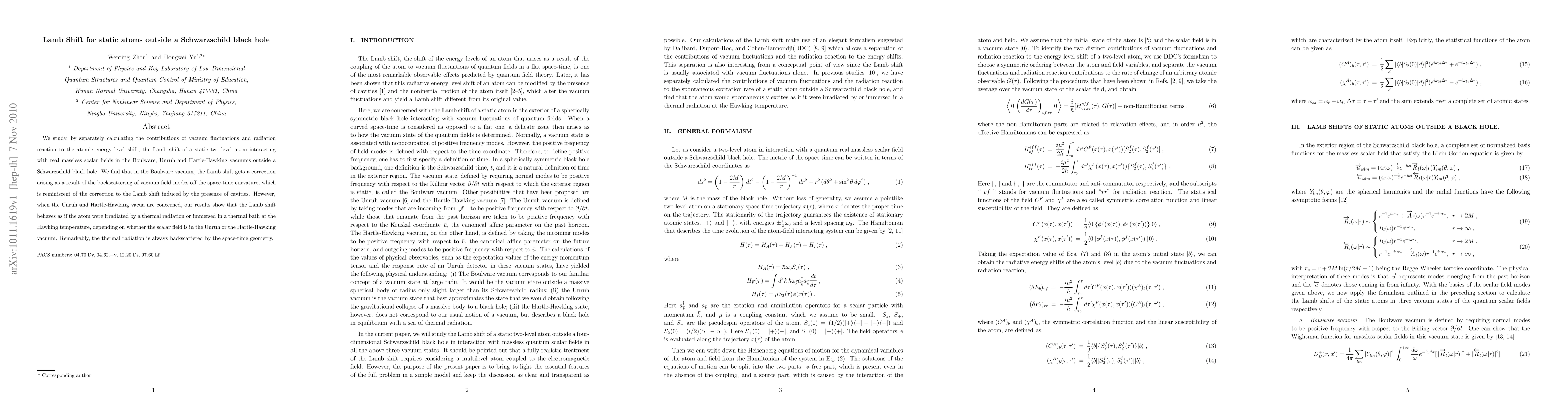 This paper investigates the Lamb shift for a static two-level atom near a Schwarzschild black hole, considering vacuum fluctuations and radiation reaction in different vacuum states. It finds that the Boulware vacuum induces a unique correction due to space-time curvature, while the Unruh and Hartle-Hawking vacua cause the Lamb shift to behave as if influenced by thermal radiation at the Hawking temperature.