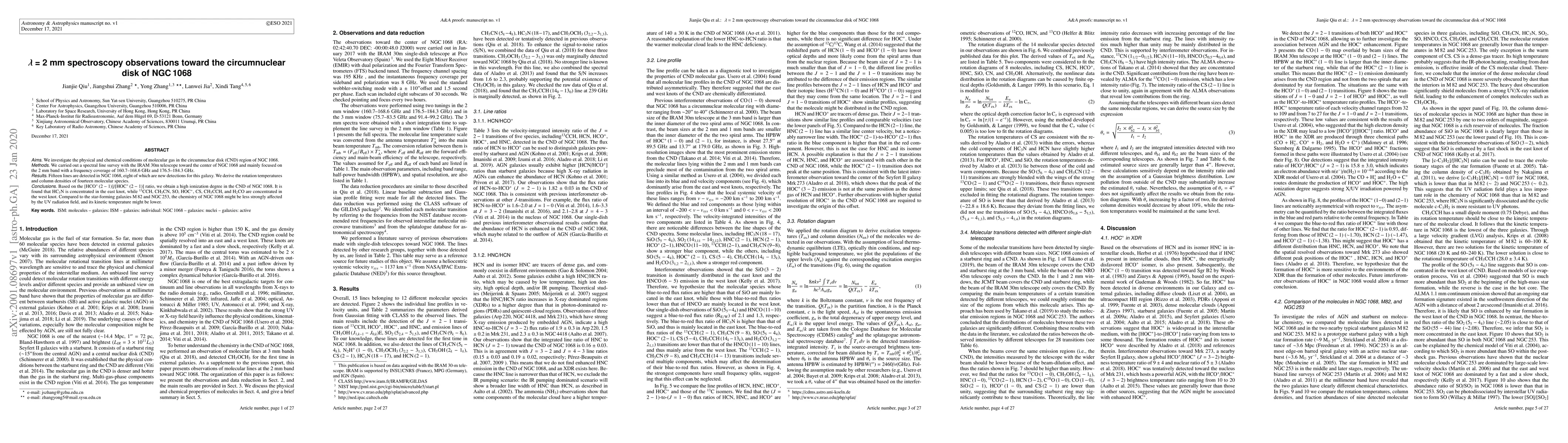 Aims. We investigate the physical and chemical conditions of molecular gas in the circumnuclear disk (CND) region of NGC 1068. Methods. We carried out a spectral line survey with the IRAM 30m telescope toward the center of NGC 1068 and mainly focused on the 2 mm band with a frequency coverage of 160.7-168.6 GHz and 176.5-184.3 GHz. Results. Fifteen lines are detected in NGC 1068, eight of which are new detections for this galaxy. We derive the rotation temperatures and column densities of fourteen molecular species. Conclusions. Based on the [HCO+ (2 - 1)]/[HOC+ (2 - 1)] ratio, we obtain a high ionization degree in the CND of NGC 1068. It is found that HC3N is concentrated in the east knot, while 13CCH, CH3CN, SO, HOC+, CS, CH3CCH, and H2CO are concentrated in the west knot. Compared to the star-forming galaxies M 82 and NGC 253, the chemistry of NGC 1068 might be less strongly affected by the UV radiation field, and its kinetic temperature might be lower.