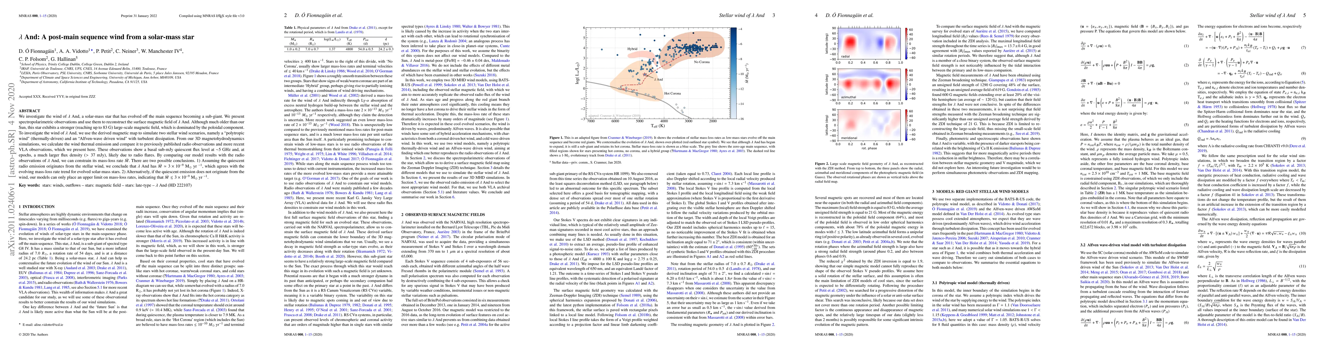 This paper investigates the wind of lambda And, a sub-giant star with a strong magnetic field, using spectropolarimetry and 3D magnetohydrodynamics simulations. The study finds a mass-loss rate of ~3e-9 Msun/yr if the quiescent radio emission originates from the stellar wind, or an upper limit if it does not.