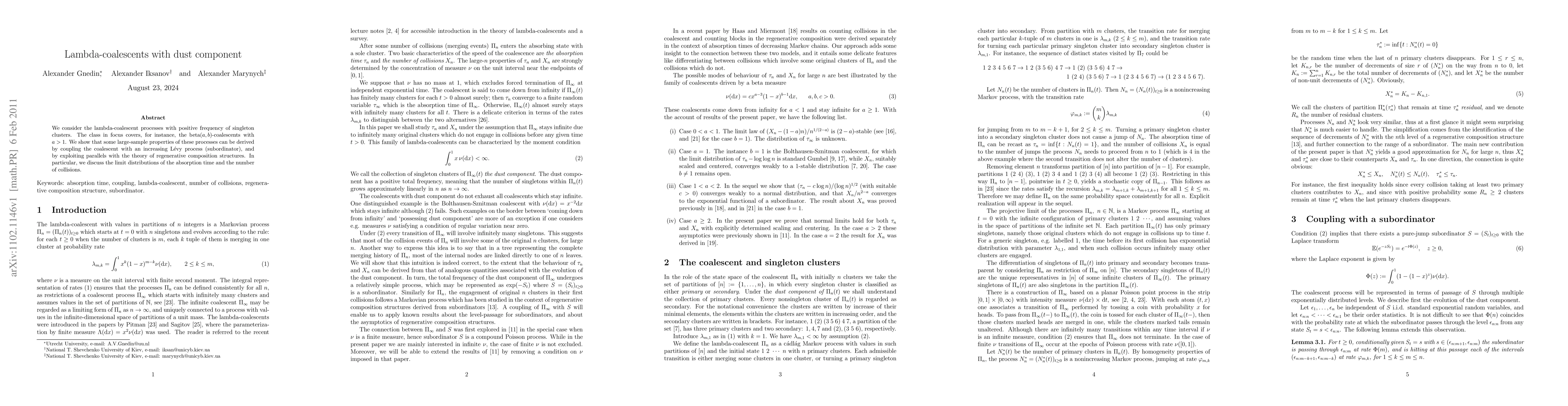 This paper investigates lambda-coalescent processes with a positive frequency of singleton clusters, demonstrating that large-sample properties can be derived by coupling the coalescent with an increasing Lévy process. It focuses on limit distributions of absorption time and the number of collisions.