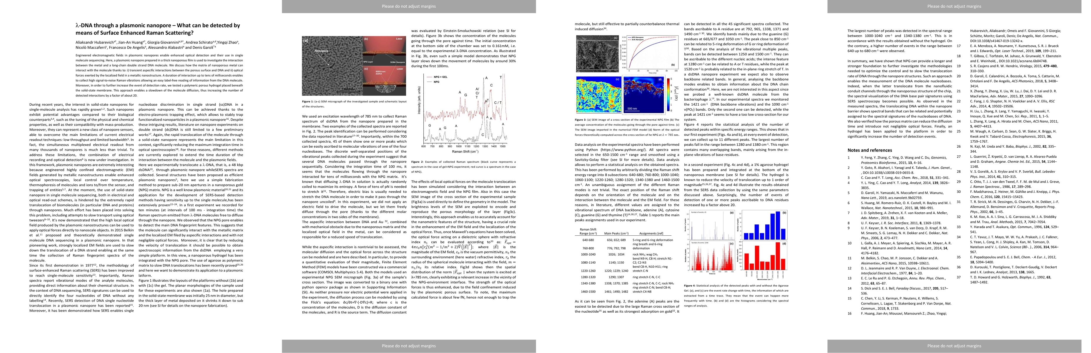 This study investigates the interaction between lambda DNA and plasmonic nanopores using Surface Enhanced Raman Scattering (SERS) for label-free detection. The enhanced optical fields in the nanopores allow high signal-to-noise Raman signals, facilitating the reading of DNA information, while a polymeric hydrogel increases the detection rate by slowing molecule diffusion.