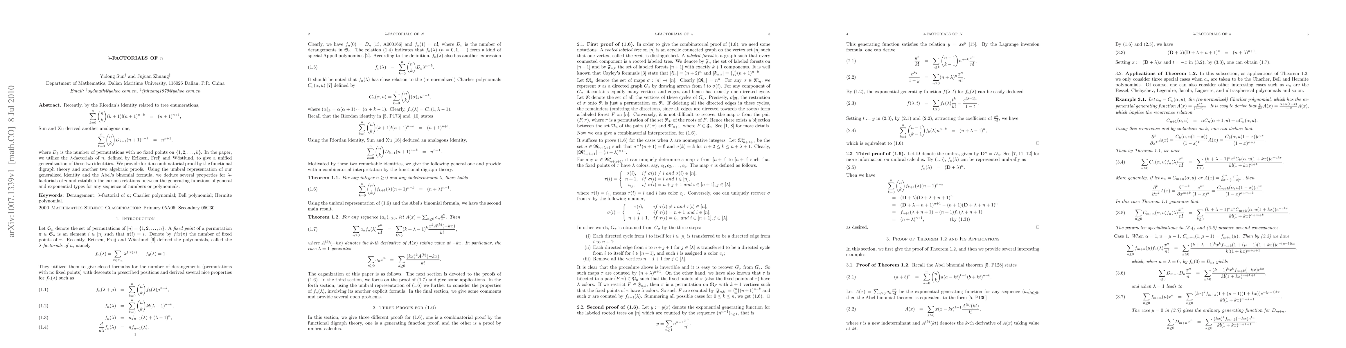 Recently, by the Riordan's identity related to tree enumerations, \begin{eqnarray*} \sum_{k=0}^{n}\binom{n}{k}(k+1)!(n+1)^{n-k} &=& (n+1)^{n+1}, \end{eqnarray*} Sun and Xu derived another analogous one, \begin{eqnarray*} \sum_{k=0}^{n}\binom{n}{k}D_{k+1}(n+1)^{n-k} &=& n^{n+1}, \end{eqnarray*} where $D_{k}$ is the number of permutations with no fixed points on $\{1,2,\dots, k\}$. In the paper, we utilize the $\lambda$-factorials of $n$, defined by Eriksen, Freij and W$\ddot{a}$stlund, to give a unified generalization of these two identities. We provide for it a combinatorial proof by the functional digraph theory and another two algebraic proofs. Using the umbral representation of our generalized identity and the Abel's binomial formula, we deduce several properties for $\lambda$-factorials of $n$ and establish the curious relations between the generating functions of general and exponential types for any sequence of numbers or polynomials.