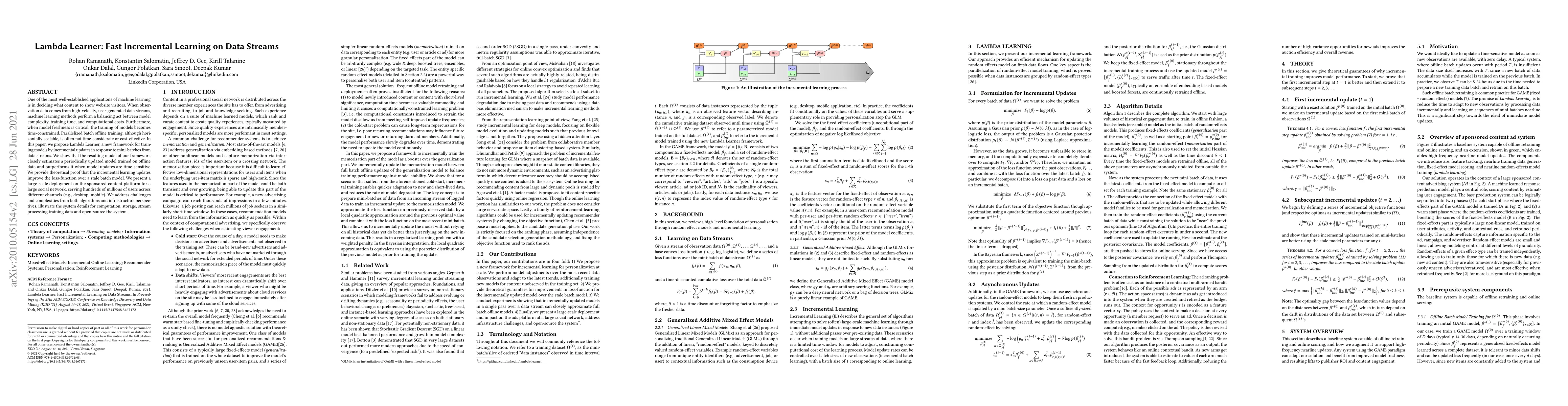 Lambda Learner proposes a framework for fast incremental learning on high-velocity data streams, achieving model freshness with reduced training time and computational costs compared to batch methods. The system demonstrates superior performance in time-sensitive model updates and has been successfully deployed on a large-scale sponsored content platform.