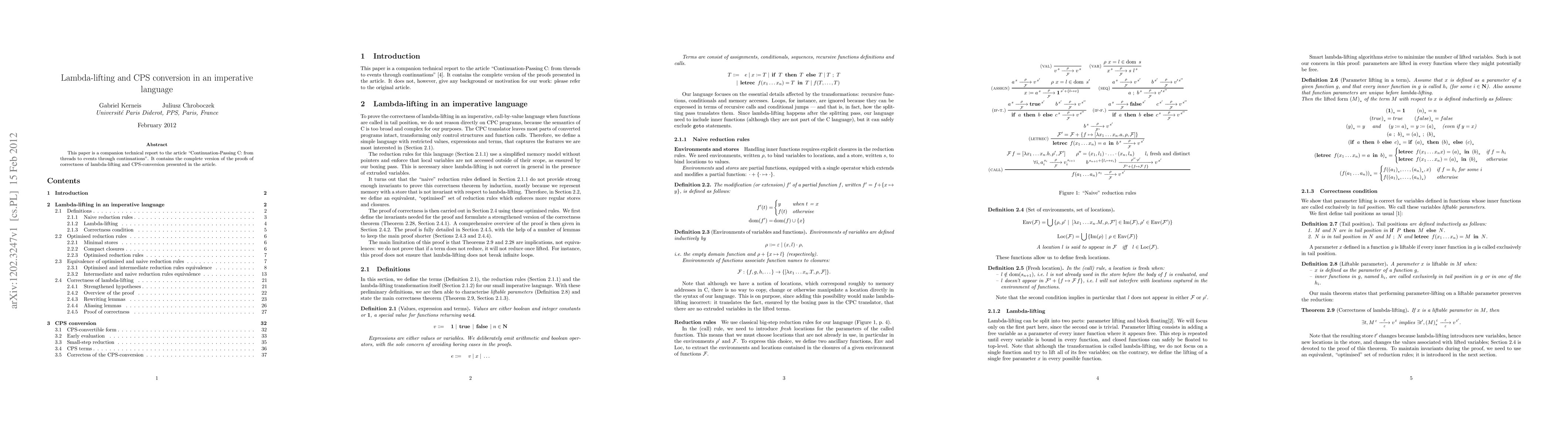 This paper provides detailed proofs for the correctness of lambda-lifting and Continuation-Passing Style (CPS) conversion in an imperative language, serving as a companion technical report to a related article on Continuation-Passing C. It elaborates on the transformation techniques from threads to events using continuations.