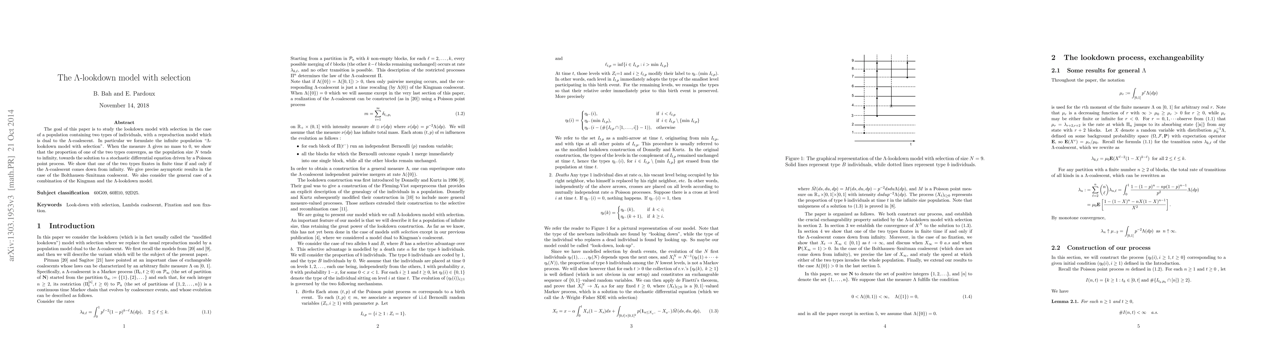 The goal of this paper is to study the lookdown model with selection in the case of a population containing two types of individuals, with a reproduction model which is dual to the $\Lambda$-coalescent. In particular we formulate the infinite population "$\Lambda$-lookdown model with selection". When the measure $\Lambda$ gives no mass to 0, we show that the proportion of one of the two types converges, as the population size $N$ tends to infinity, towards the solution of a stochastic differential equation driven by a Poisson point process. We show that one of the two types fixates in finite time if and only if the $\Lambda$-coalescent comes down from infinity. We give precise asymptotic results in the case of the Bolthausen-Sznitman coalescent. We also consider the general case of a combination of the Kingman and the $\Lambda$-lookdown model.